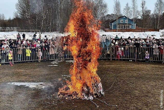 Чучело Масленицы у усадьбы сожгли в 15 часов. В этом году масленичный костер зажигали от живого огня.