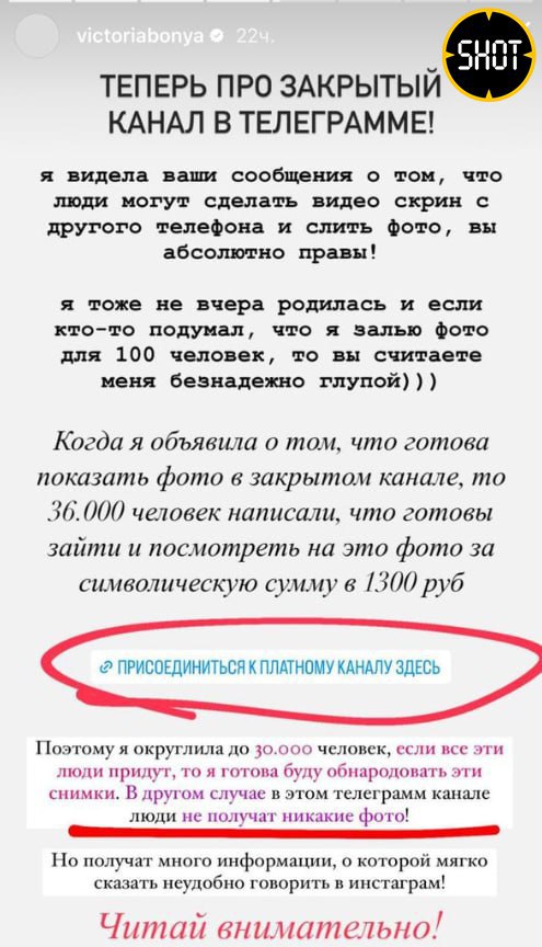 Боня сначала устроила хороший прогрев к своей новой "телеге" — переделала себе лицо у американского звёздного хирурга, который оперировал Беллу Хадид и Кендалл Дженнер. Похвасталась, что теперь и у неё "лисьи глазки". Выложила фотку, где засветился один опухший глаз. А после хейта со слезами заявила, что больше своё лицо никому не покажет. Хотя за деньги — да. Она создала закрытый канал и пообещала эксклюзивные снимки там за "символическую" плату— 1300 рублей.