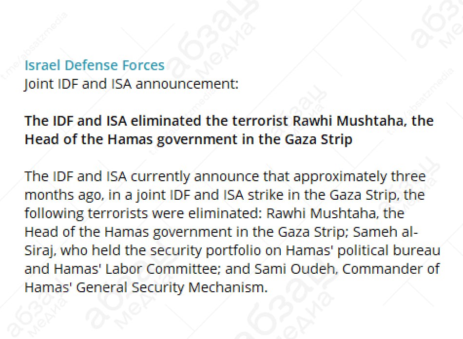❗️Армия Израиля заявила о «ликвидации» главы правительства ХАМАС в секторе Газа