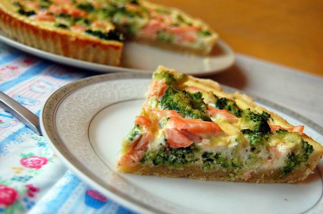 4. Рыбу и брокколи солим и выкладываем в подготовленную корзинку.