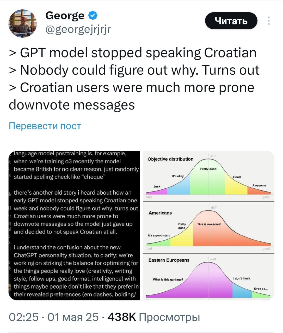 Оказалось, хорваты так часто хейтили и писали негативные отзывы, что нейронка неделю игнорила их в чате. Поэтому GPT-4o так лесно общается с юзерами сегодня.