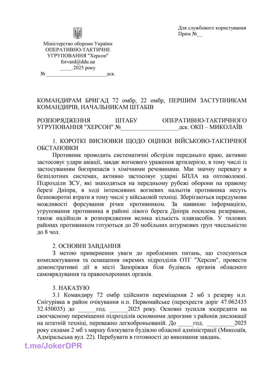 Мои хакеры стащили с компьютера одного из сотрудников СБУ макет интереснейшего документа. Если это не подготовка подставы командования группировки «Херсон» ВСУ со стороны СБУ и документ реальный, то получается, что некоторые украинские командиры готовят вооружённый мятеж.