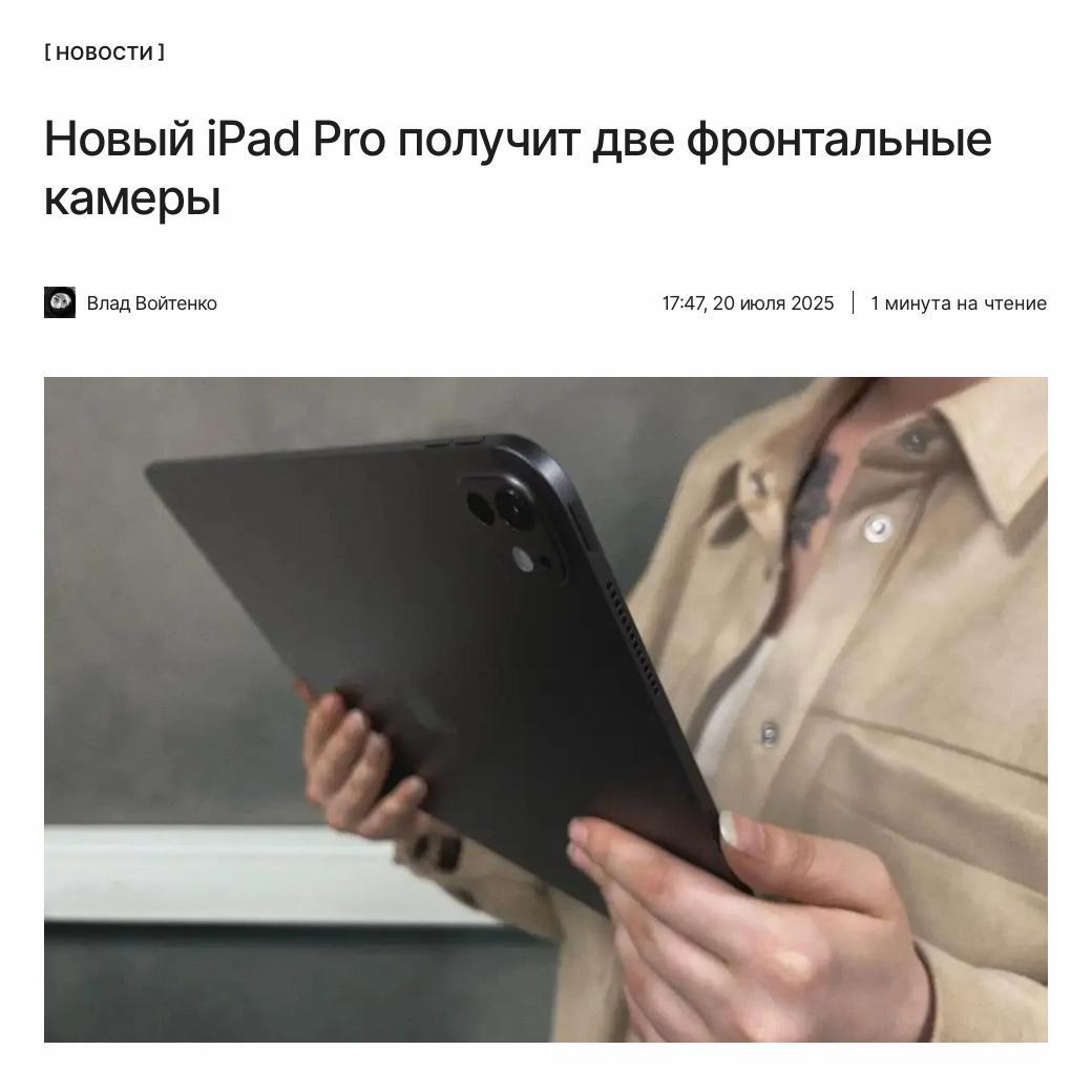 iPad Pro с новым процессором M5 получит две «фронталки», следует из рассылки Марка Гурмана в Bloomberg.
