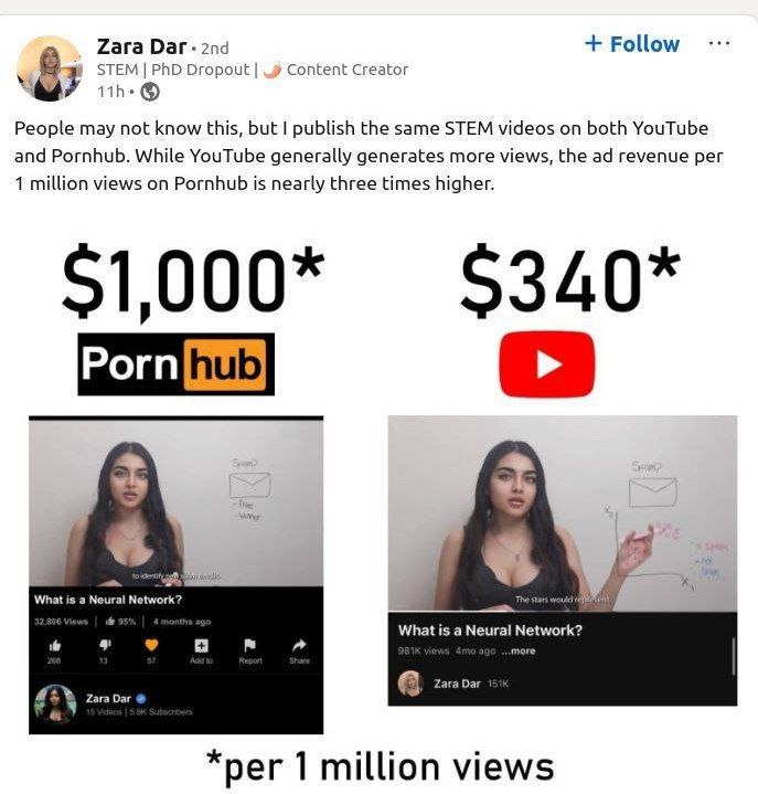 Pornhub оказался лучше по монетизации, чем YouTube для обучающих блогов. Блогер рассказала, что доход от сервиса для взрослых — порядка $1000 за 1 млн просмотров, когда у YouTube — всего $340. При этом она размещает на двух ресурсах лекции по математике и машинному обучению. @banksta