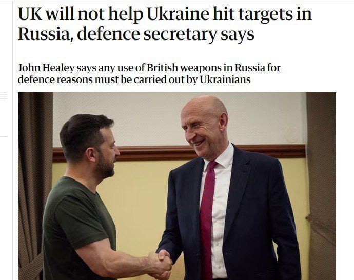 Глава британского оборонного ведомства высказался против какой-либо помощи Украине со стороны Лондона в поражении целей на территории России. Как сообщает The Guardian, Джон Хили заявил, что британское оружие предоставляется Украине для защиты, и это не мешает использование его по целям в России, но без британского участия.