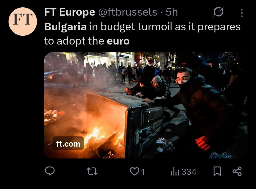 Правительство Болгарии во вторник отозвало из парламента проект бюджета на следующий год. На демонстрации протеста против этого бюджета, в котором планировалось повысить налоги на частный бизнес и дивиденды компаний, в последние дни выходили тысячи жителей Софии и других болгарских городов. Причина - Болгария пытается помочь Украине и наполнить оборонный бюджет, который уже превысил 2,4% ВВП.