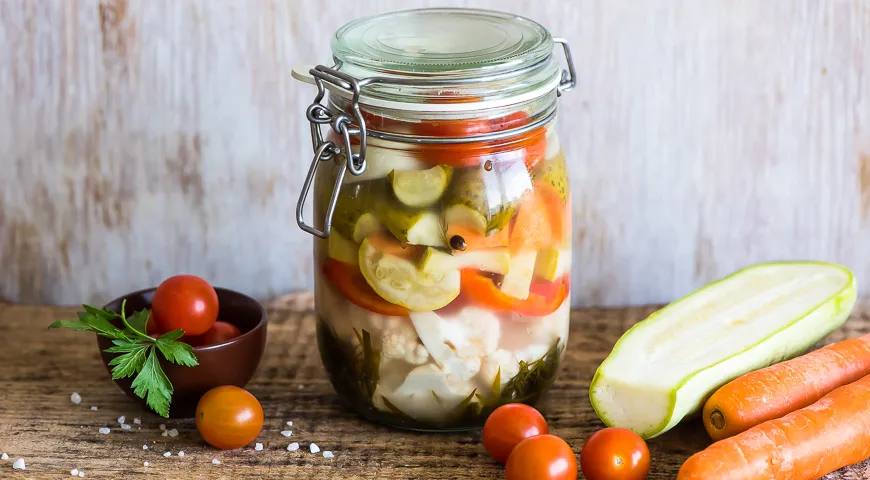 1․ Крупные патиссоны разрежьте на несколько частей, мелкие оставьте целыми. Перец очистите от семян и нарежьте крупными кусочками. Цветную капусту разрежьте на 4 части. Кабачки нарежьте кольцами.