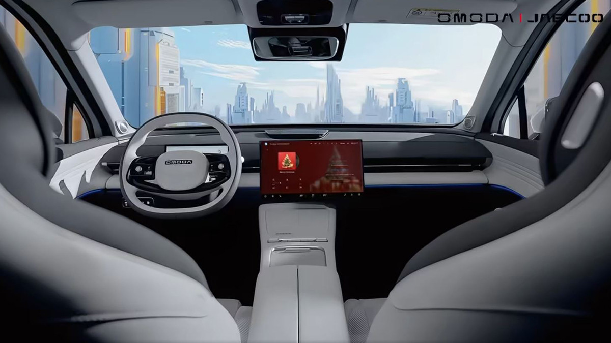 Интерьер Omoda C7 оформлен в стиле минимализма. Перед водителем располагается мультифункциональное рулевое колесо с «приплюснутым» с двух сторон ободом и небольшой горизонтальный дисплей, исполняющий роль виртуального щитка приборов. Также на передней панели расположен сдвижной тачскрин информационно-развлекательной системы диагональю 15,6 дюйма (разрешение 2,5K). В компании отметили, что экраном можно без проблем пользоваться даже при попадании на него прямых солнечных лучей из-за специального «антибликового эффекта».