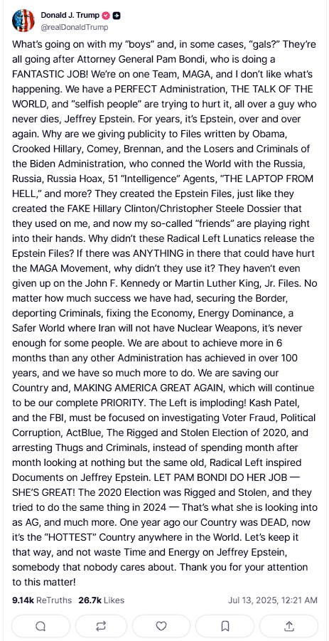 Новый день — новые обвинения от Трампа. Теперь он назвал Обаму, Хиллари Клинтон и их соратников-демократов авторами «списка Эпштейна». В своём посте в Truth Social президент также выступил с защитой генпрокурора Пэм Бонди — её раскритиковали после публикации служебной записки об обвиняемом в склонении несовершеннолетних к проституции Джеффри Эпштейне. По словам Трампа, Бонди выполняет «фантастическую работу», а навредить ей пытаются «эгоистичные люди». А авторами списка он назвал своих политических оппонентов: Почему мы предаём огласке документы, написанные Обамой, продажной Хиллари, Коми, Бреннаном, а также неудачниками и преступниками из администрации Байдена, которые обманули весь мир с помощью мистификации «Россия, Россия, Россия», 51 «разведывательного» агента, «ноутбука из ада» и прочего? Они создали «Файлы Эпштейна» так же, как создали ФАЛЬШИВОЕ досье Хиллари Клинтон/Кристофера Стила, которое они использовали против меня, и теперь мои так называемые «друзья» играют им на руку. Почему эти радикальные левые безумцы не опубликовали «Файлы Эпштейна»? Президент также призвал директора ФБР Кэша Пателя «сосредоточиться на расследовании фальсификаций на выборах» и поимке преступников, вместо того, чтобы в очередной раз изучать материалы дела Эпштейна: Кэш Патель и ФБР должны сосредоточиться на расследовании фальсификаций на выборах, политической коррупции, ActBlue, сфальсифицированных и украденных выборов 2020 года, а также на аресте бандитов и преступников, вместо того чтобы месяц за месяцем изучать одни и те же старые документы, вдохновлённые радикальными левыми идеями, о Джеффри Эпштейне. Ранее Минюст США и ФБР выпустили совместное заявление, о том, что не обнаружили никакого компрометирующего списка клиентов, а также доказательств шантажа Эпштейном влиятельных лиц. В феврале генпрокурор Пэм Бонди в интервью Fox News сообщила, что «список у неё на столе» и ждёт изучения. Позже она заявила, что имела в виду документы по делу. Ну и не грех напомнить. Во время сетевой перепалки Трампа и Маска последний заявил, что «Списки Эпштейна» не были опубликованы, потому что в них фигурирует фамилия действующего президента. Позднее твит был удалён.
