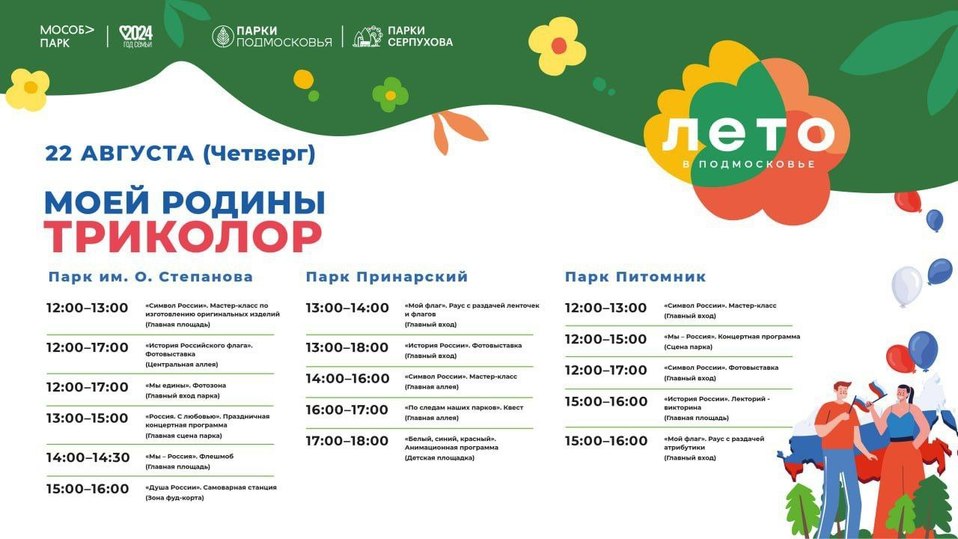 Параллельно в 12:00 праздник флага отметят в парке «Питомник». Программа насыщенная – от лектория до фотовыставки.