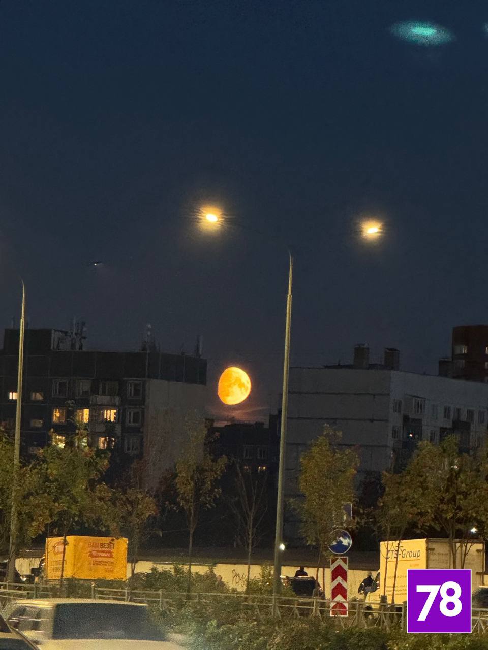 Ночное светило предстало в ярком образе. Благодаря преломлению света в атмосфере, луна приобрела насыщенный оттенок.