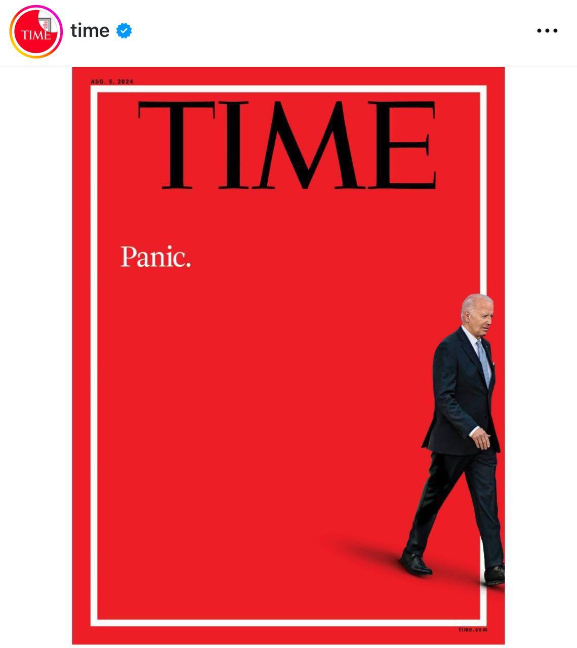 На обложке Джо Байден "выходит" из кадра, оставляя на ярко-красном фоне слово "паника".