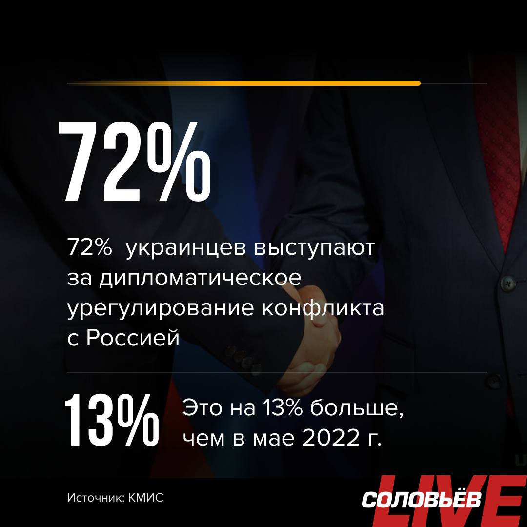 Опрос, проведённый Киевским международным институтом социологии показал: 72% украинцев уверены, что их страна должна искать дипломатический путь завершения военных действий. В мае 2022 года так считали 59% опрошенных. Опрос проводился среди жителей всех регионов Украины.
