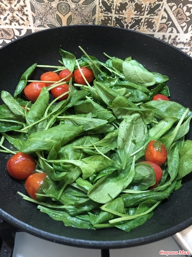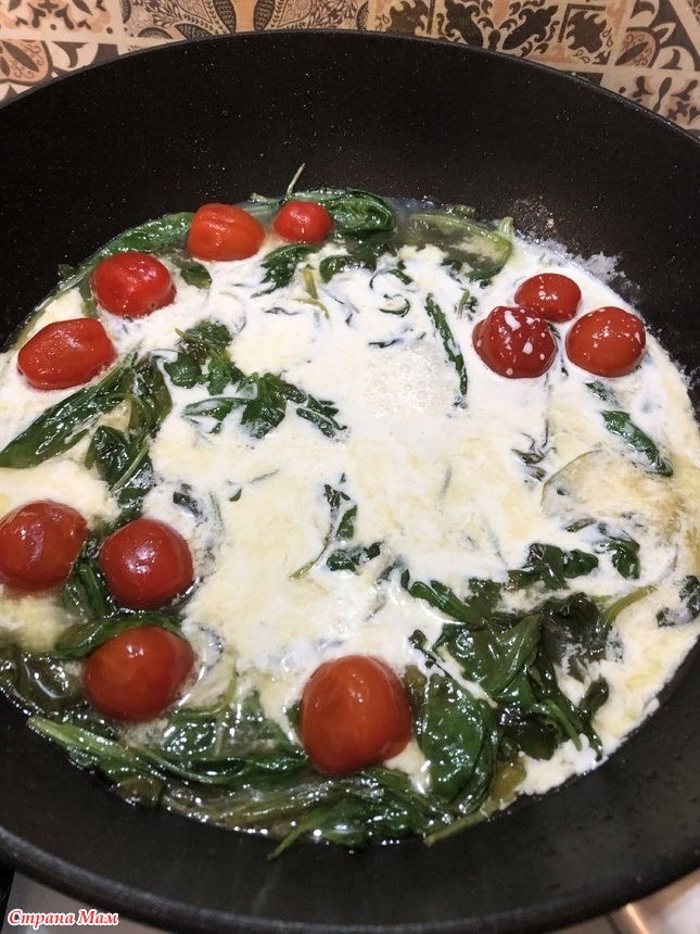 3. В большой сковороде разогреть оливковое масло, положить томаты и подержать на среднем огне около 1-2 минут, добавить шпинат, готовить еще 1-2 минуты. Увеличить огонь и влить вино. Выпаривать вино около 2 минут. Затем влить в сковороду сливки и воду из под макарон. Довести до кипения, посолить и поперчить. Добавить в сковороду отваренные макароны и креветки. Перемешать, накрыть крышкой и подержать на огне 1-2 минуты.