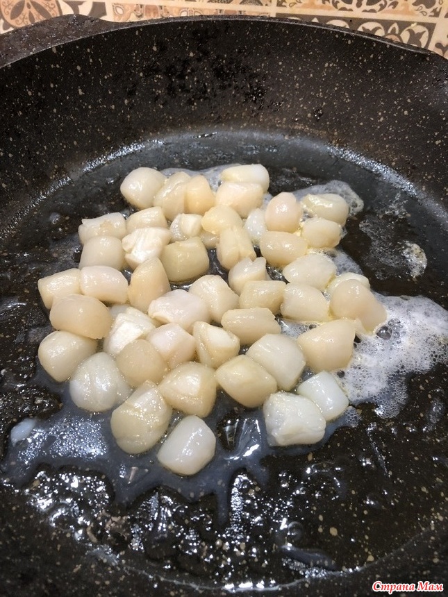 Гребешки. Мелкие, конечно, какие-то, но вкусные. Жарила их тоже на оливковом масле. Главное не передержите на огне, иначе будут резиновые.
