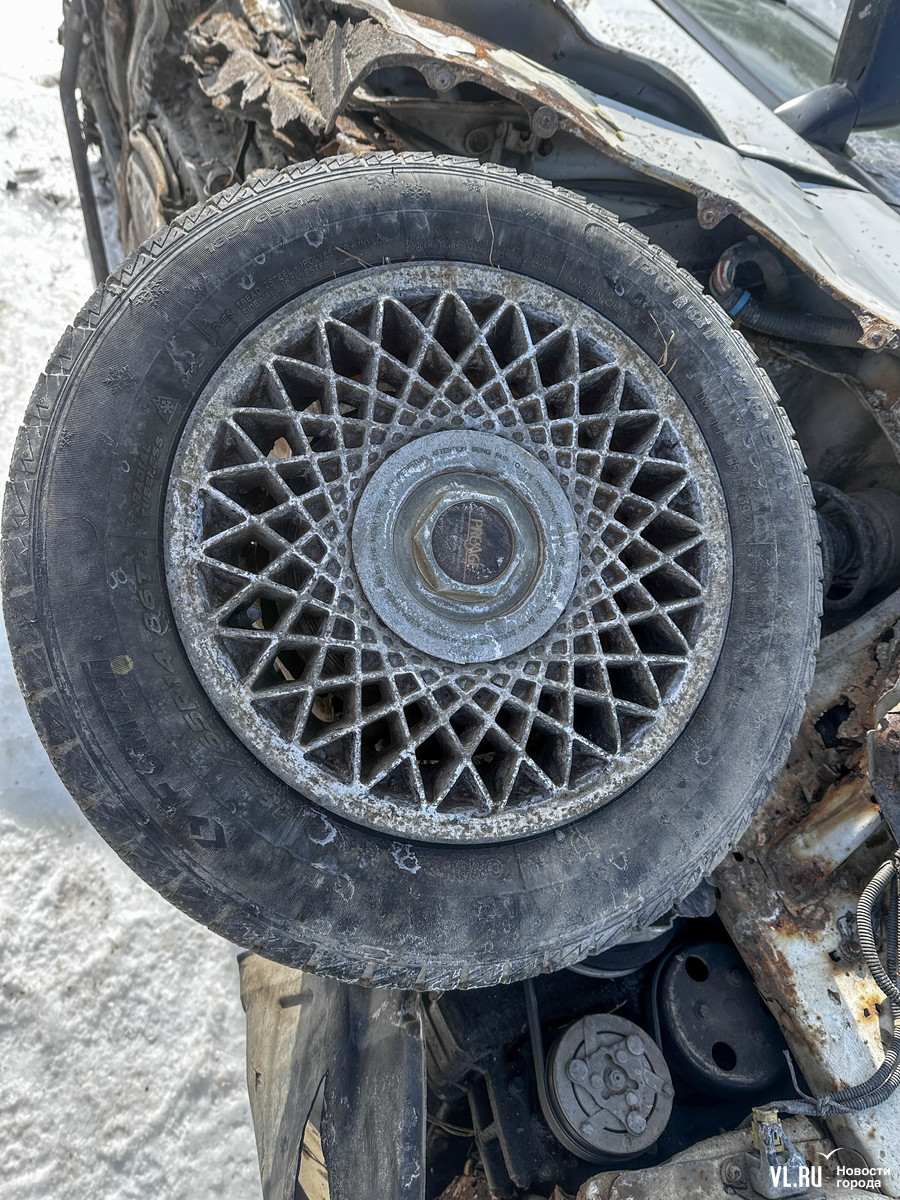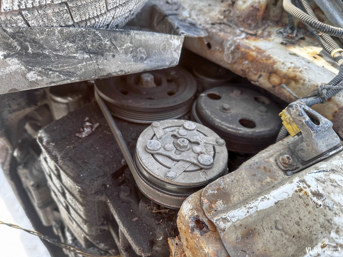 Кроме номеров отсутствуют фары. Колёса и магнитола на месте. Салон частично затоплен, вода внутри тоже замёрзла.