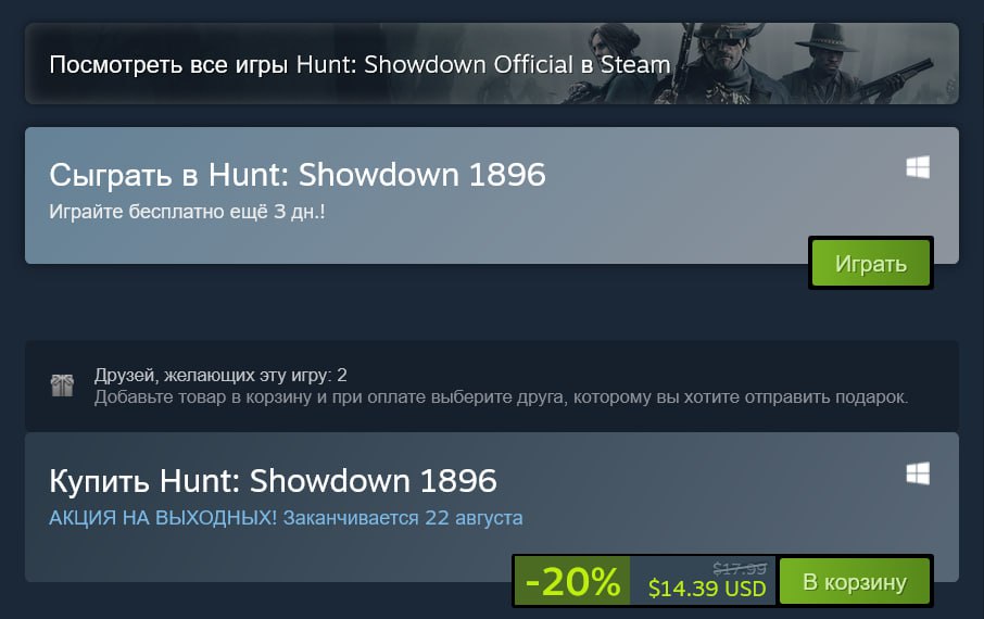 На игру также завезли скидку в честь большой обновы, урвать Hunt можно за 975 рублей.