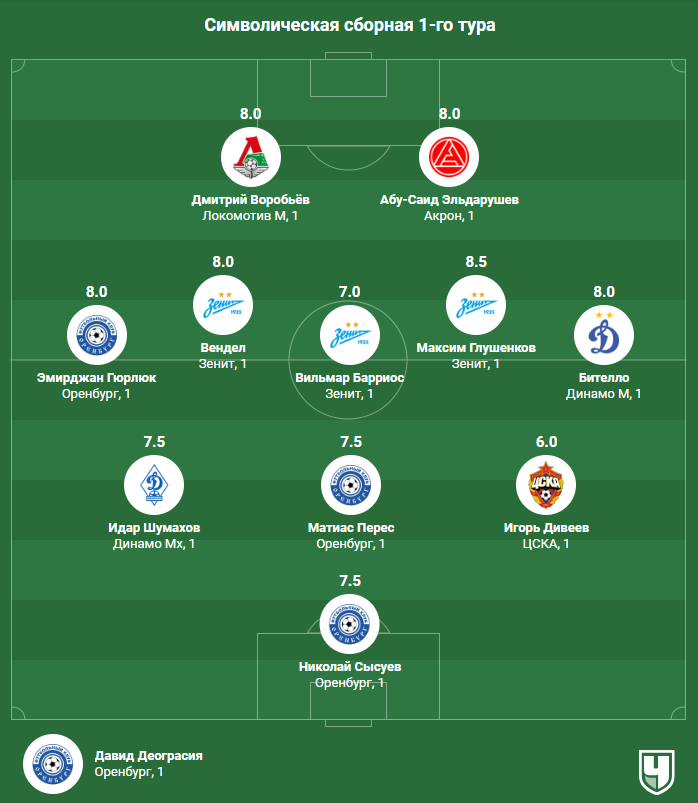 Наконец-то состоялся 1-й тур российского чемпионата! Признайтесь, тоже ведь безумно ждали начало сезона? Иначе зачем вам было сюда кликать. Мы собрали 12 героев, чей вклад неоспорим. В сборную попали футболисты «Оренбурга», «Зенита», «Локомотива», ЦСКА, «Акрона» и сразу двух «Динамо», схема — 3-5-2. Да, набор прям богатый.