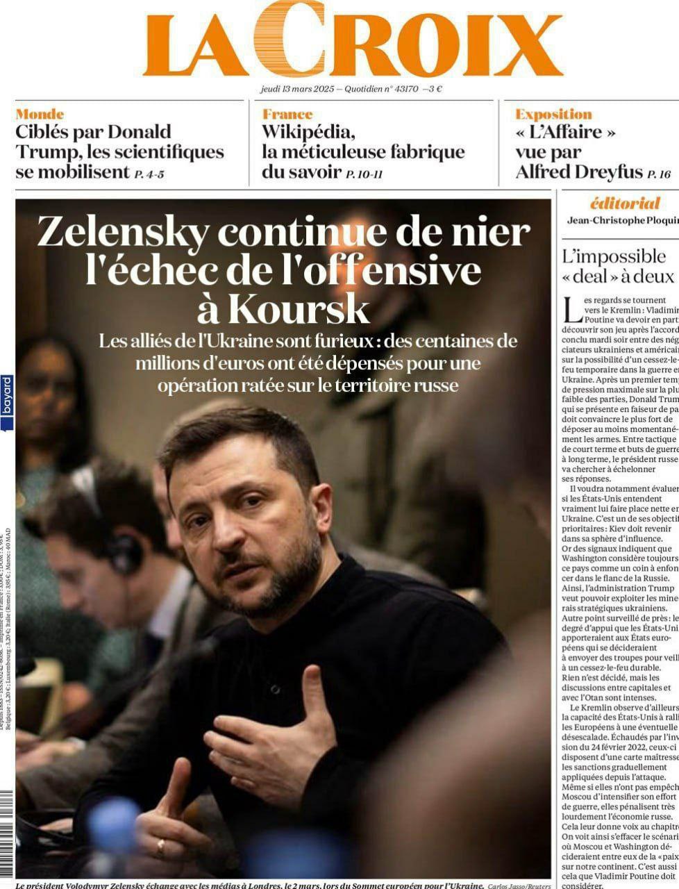 "Зеленский продолжает отрицать провал курской операции. Союзники Украины в ярости: сотни миллионов евро были потрачены на провалившуюся операции на территории России", - La Croix.