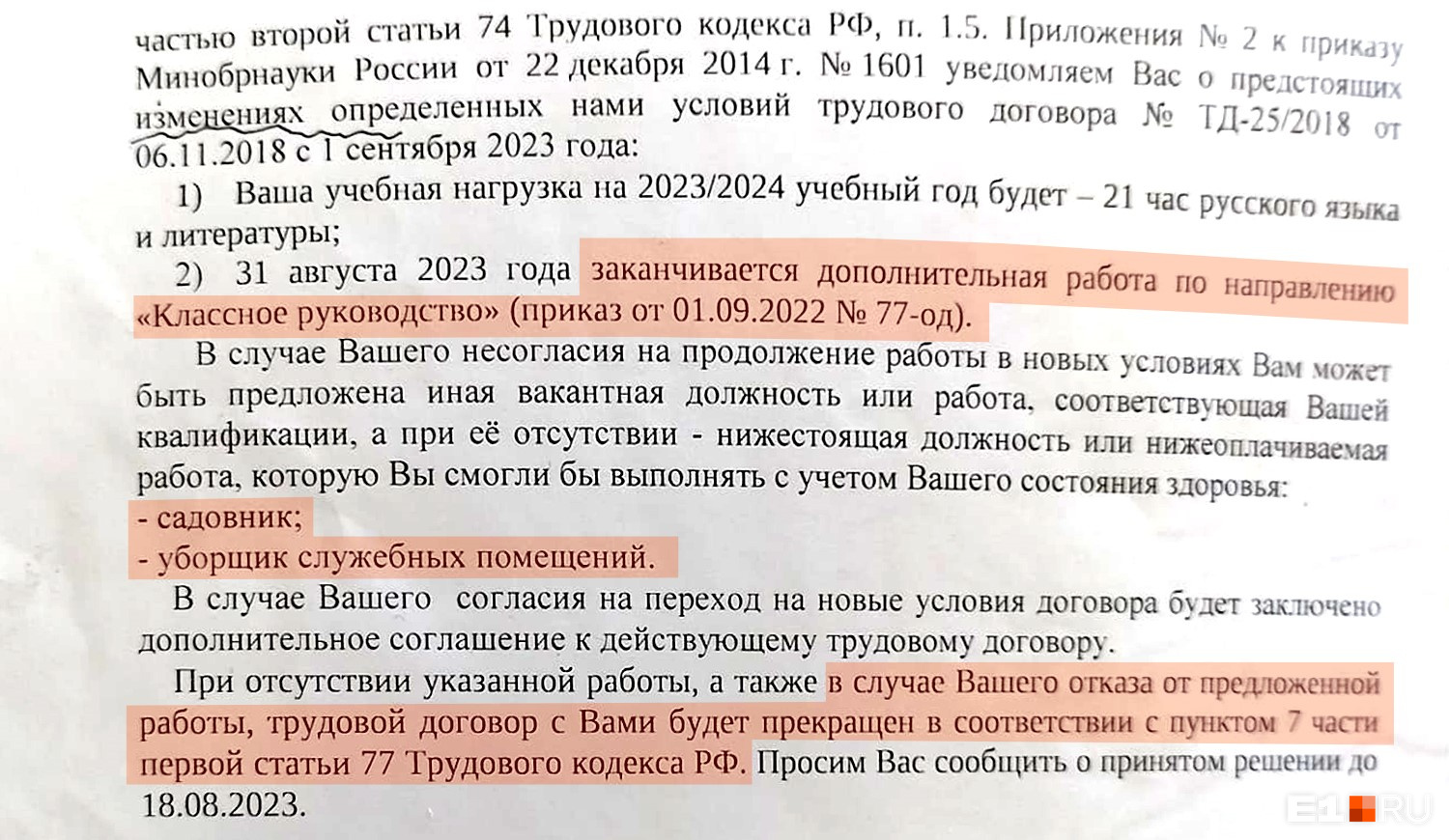 В школе-интернате корреспонденту E1.RU пояснили, что учителю выдали уведомление об изменении условий трудового договора согласно статье 74 ТК РФ. От других комментариев там отказались. Иначе говоря, школа предупредила педагога о новых условиях за два месяца до того, как они вступят в силу, не нарушая Трудовой кодекс.