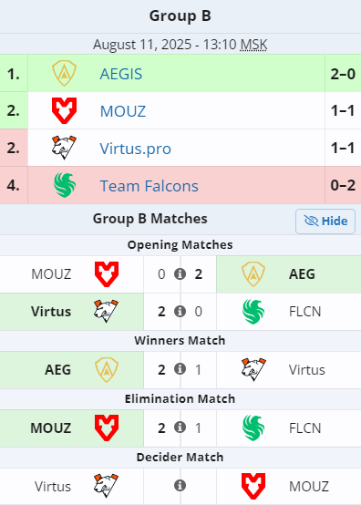 В параллельном матче Team Falcons уступила MOUZ со счетом 1:2 и завершила выступление на турнире. Virtus.pro сразится с MOUZ в решающей встрече группы 13 августа в 13:10 мск.
