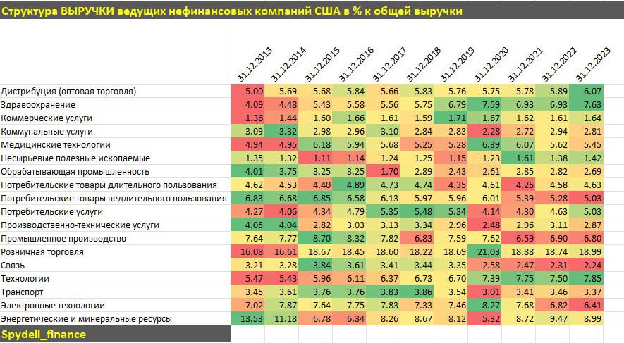 8 секторов показывают негативную динамику год к году, образующих треть от совокупной выручки (подробно показаны в таблице), а это чертовски много.