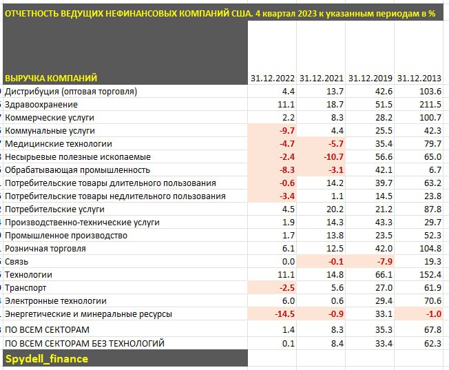 Удалось частично интегрировать отчеты по всем публичным нефинансовым компаниям США, но примерно 2.5% выручки компаний были исключены из расчетов, т.к. по ним еще нет консолидированных отчетов за 4кв23.