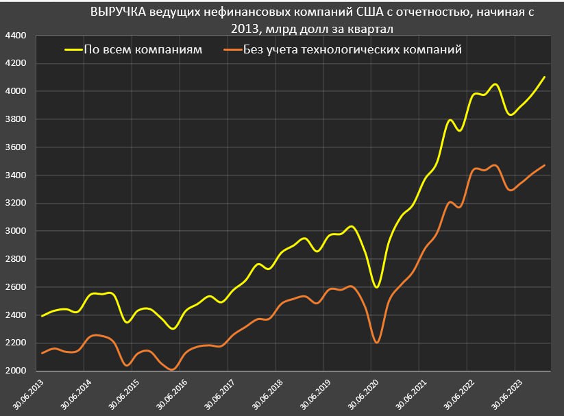 Какая реальность? Что же получилось? Выручка всех нефинансовых компаний выросла всего лишь на 1.4% г/г по номиналу, а без технологического сектора рост на символические 0.1% (!!!) и это последние доступные корпоративные отчеты по собственным расчетам.