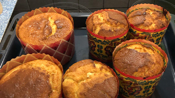 Наполнить тестом порционные формочки для выпекания, лучше всего бумажные. Каждая должна быть залита только на половину. Дать тесту немного подойти в этих формах и отправить в разогретую до 180 градусов духовку выпекаться.