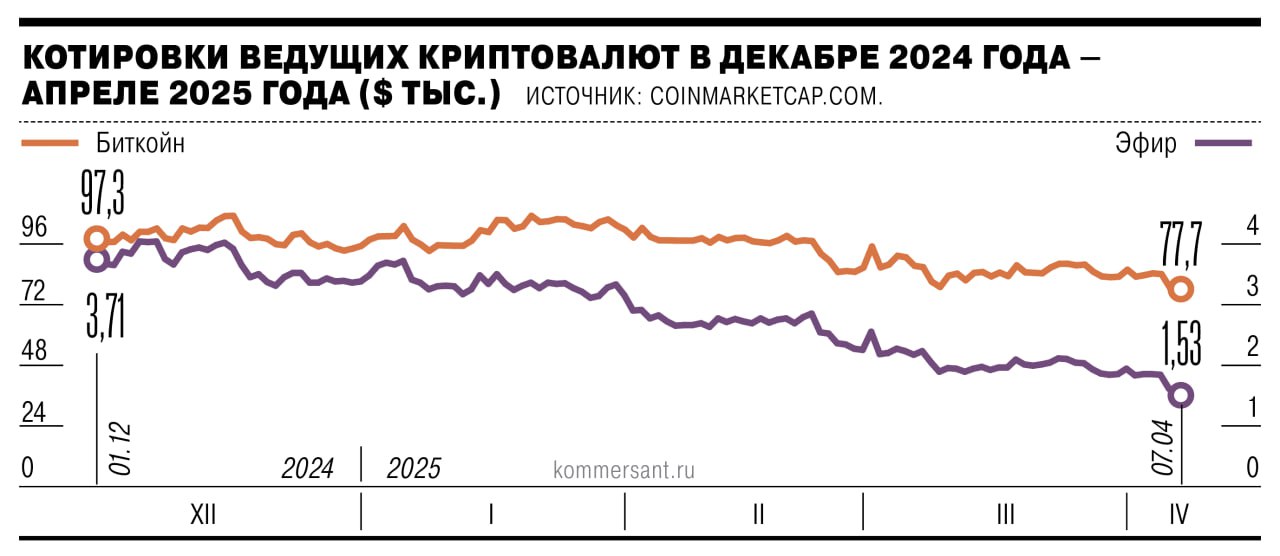 π ΠΠ½Π²Π΅ΡΡΠΎΡΡ ΠΏΠΎ Π²ΡΠ΅ΠΌΡ ΠΌΠΈΡΡ ΠΏΡΠΎΠ΄ΠΎΠ»ΠΆΠ°ΡΡ ΡΠ΅Π°Π³ΠΈΡΠΎΠ²Π°ΡΡ Π½Π° ΠΎΠ±ΡΡΠ²Π»Π΅Π½ΠΈΠ΅ ΠΏΡΠ΅Π·ΠΈΠ΄Π΅Π½ΡΠΎΠΌ Π‘Π¨Π ΠΠΎΠ½Π°Π»ΡΠ΄ΠΎΠΌ Π’ΡΠ°ΠΌΠΏΠΎΠΌ Π³Π»ΠΎΠ±Π°Π»ΡΠ½ΠΎΠΉ ΡΠ°ΡΠΈΡΠ½ΠΎΠΉ Π²ΠΎΠΉΠ½Ρ. ΠΠ° Π΄Π²Π° Π΄Π½Ρ Π²Π΅Π΄ΡΡΠΈΠ΅ Π²ΠΈΡΡΡΠ°Π»ΡΠ½ΡΠ΅ Π²Π°Π»ΡΡΡ ΠΏΠΎΡΠ΅ΡΡΠ»ΠΈ Π² ΡΠ΅Π½Π΅ Π΄ΠΎ 25%, ΠΎΡΠΊΠ°ΡΠΈΠ²ΡΠΈΡΡ Π΄ΠΎ ΠΌΠ½ΠΎΠ³ΠΎΠΌΠ΅ΡΡΡΠ½ΡΡ ΠΌΠΈΠ½ΠΈΠΌΡΠΌΠΎΠ². Π’Π°ΠΊ, 7 Π°ΠΏΡΠ΅Π»Ρ ΠΊΡΡΡ Π±ΠΈΡΠΊΠΎΠΉΠ½Π° (BTC) ΠΏΠ°Π΄Π°Π» Π΄ΠΎ ΠΎΡΠΌΠ΅ΡΠΊΠΈ $74,5 ΡΡΡ., ΡΡΠΎ ΡΡΠ°Π»ΠΎ ΠΌΠΈΠ½ΠΈΠΌΡΠΌΠΎΠΌ Ρ 7 Π½ΠΎΡΠ±ΡΡ 2024 Π³ΠΎΠ΄Π°
