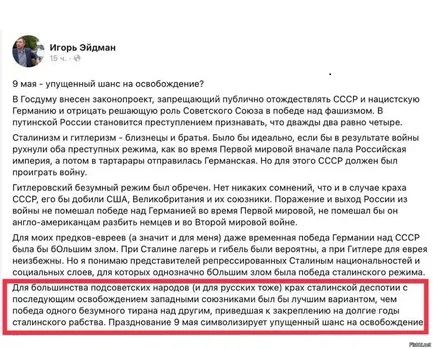 Выступает с реабилитацией фашизма в канун Дня Победы 9 мая, утверждая, что население СССР выиграло бы в случае поражения и захвата гитлеровцами.