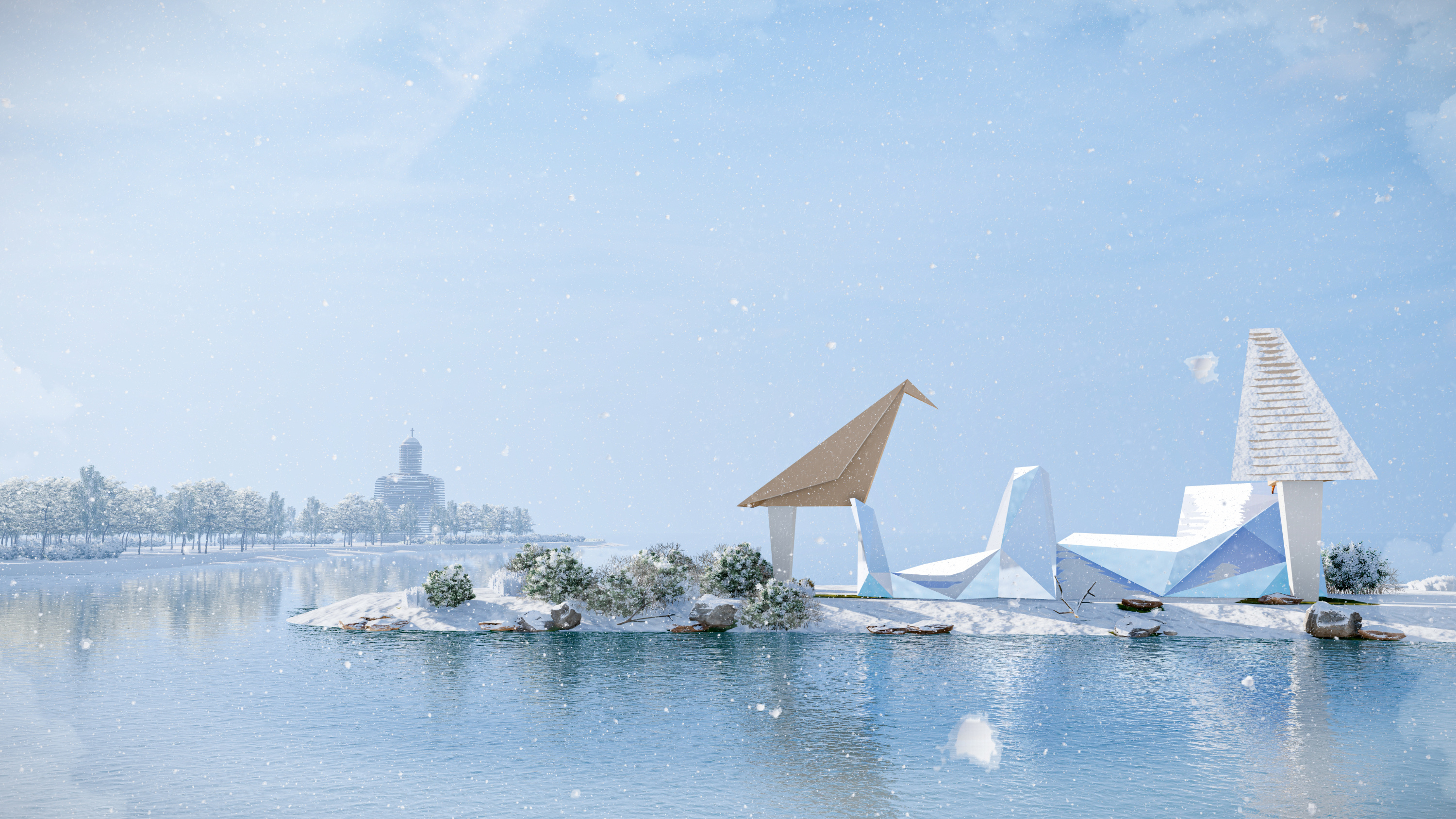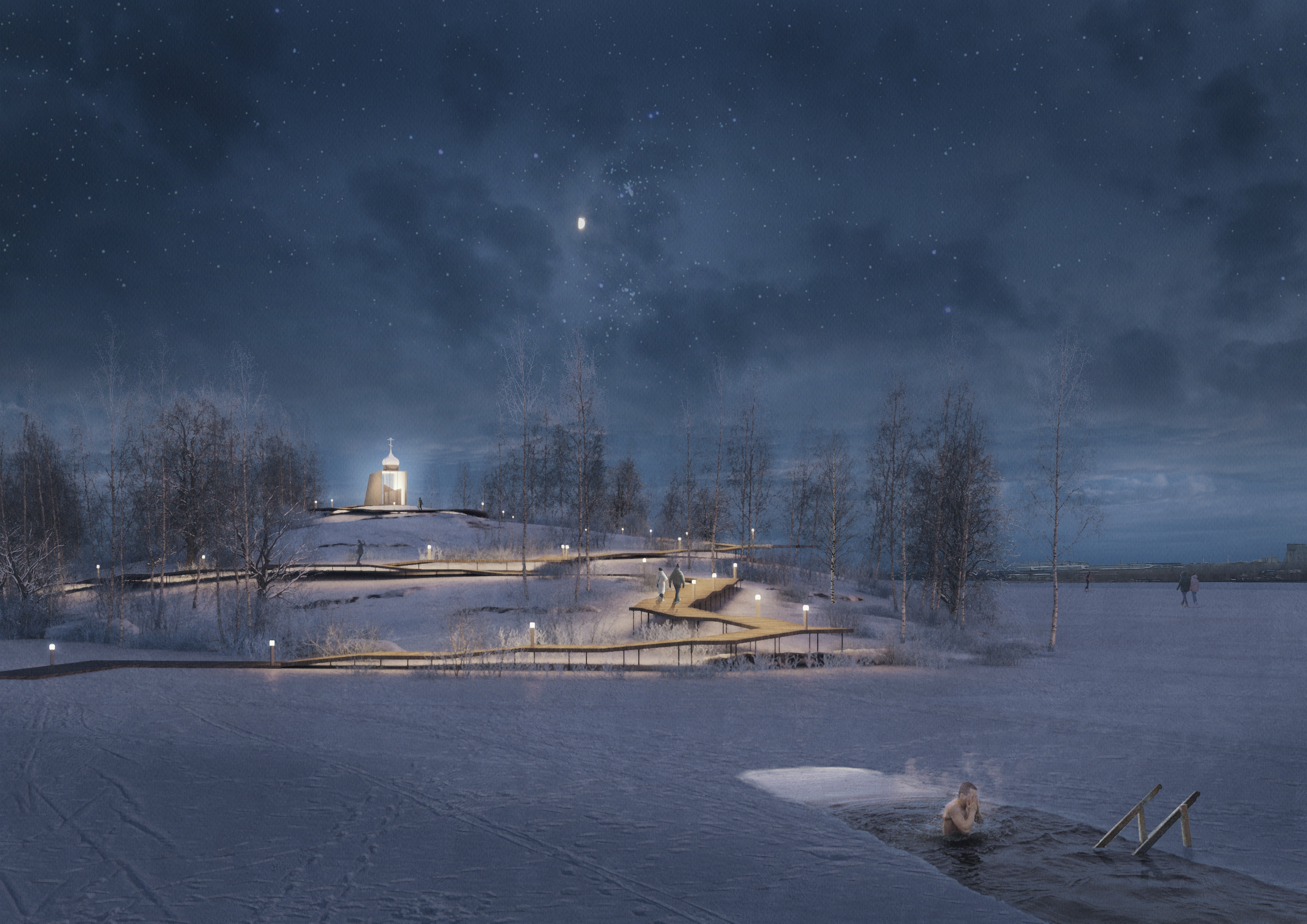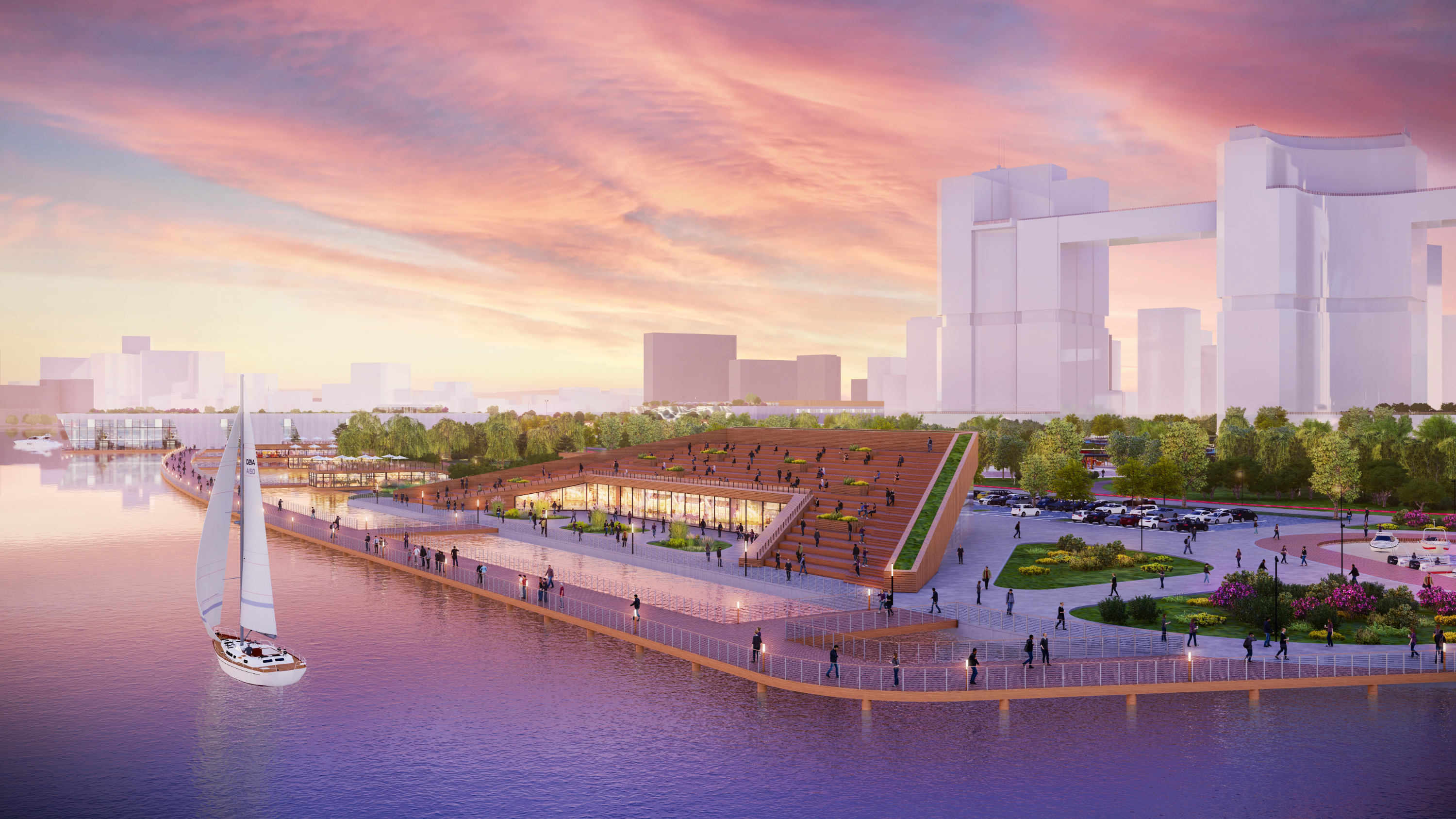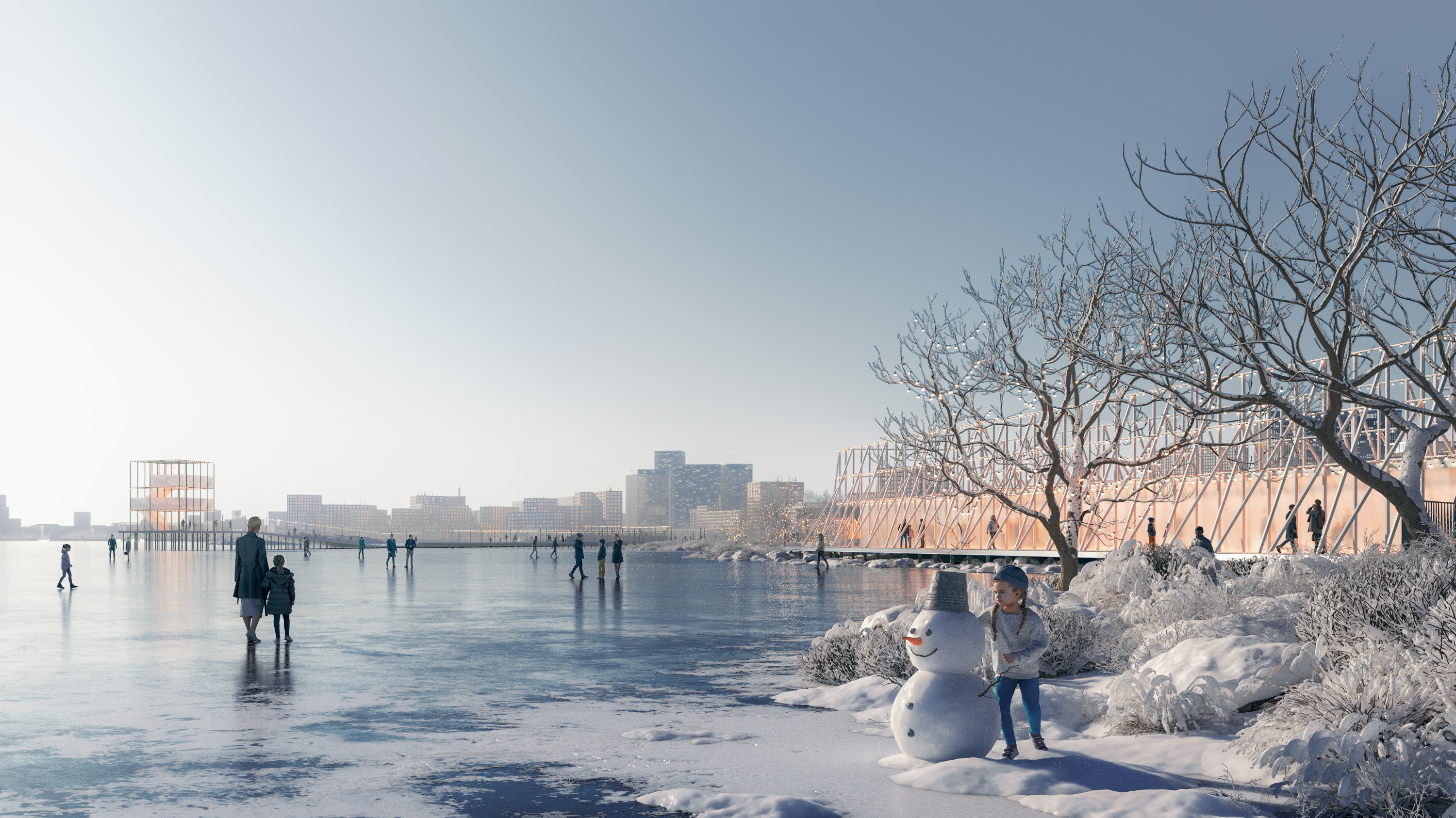 Так выглядит общий вид на набережную. Зимой на событийной площади можно будет ставить елку, на острове Баран — скатываться на бубликах, а по всему пруду кататься на коньках.