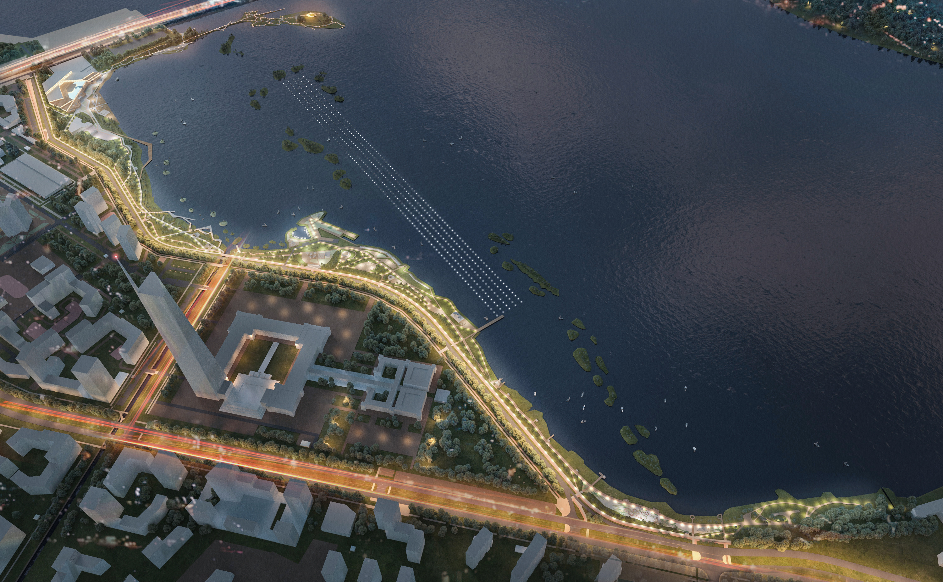 Ниже — вид на Малый Конный Полуостров с пирсом гребного канала, спортплощадками и смотровой башней.