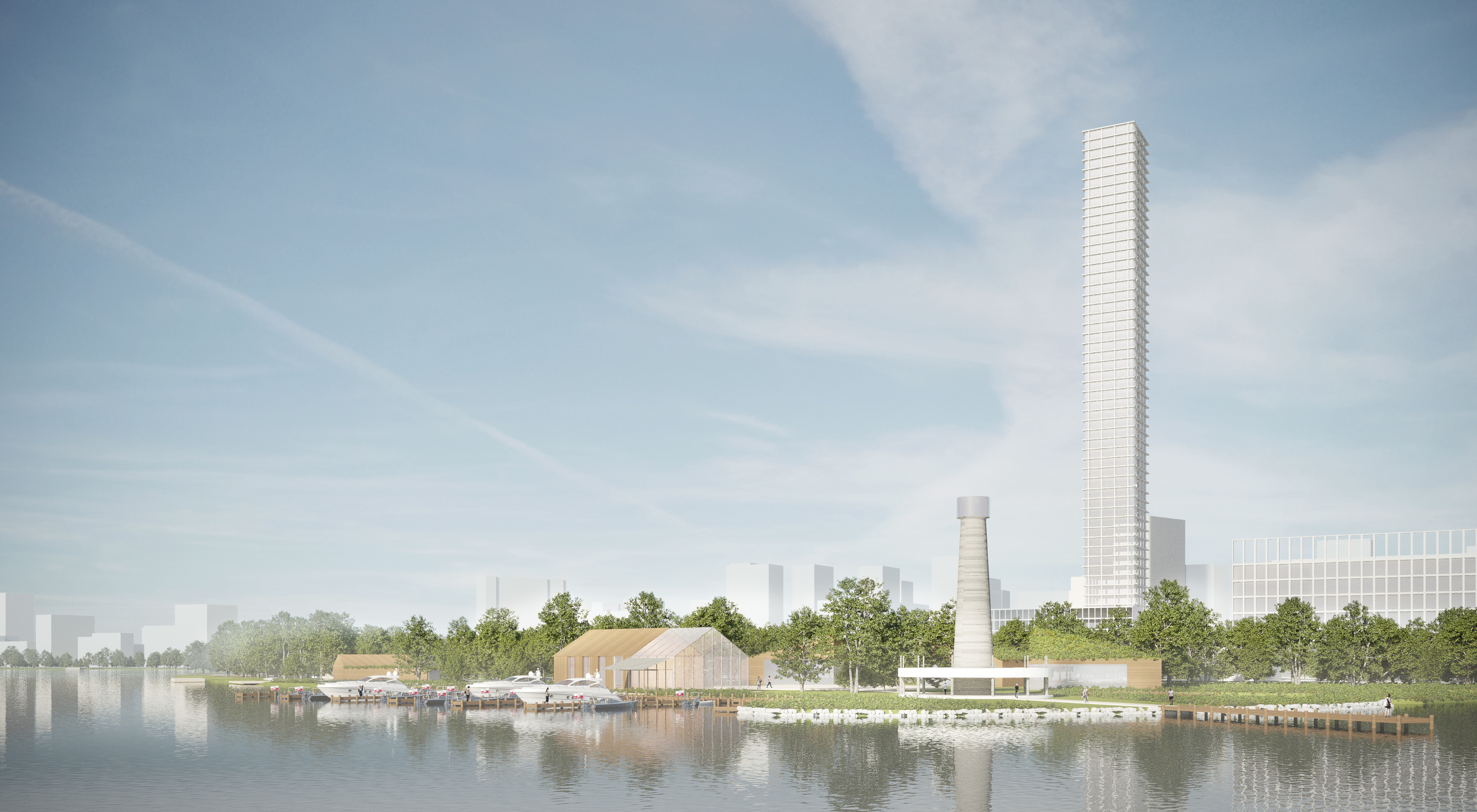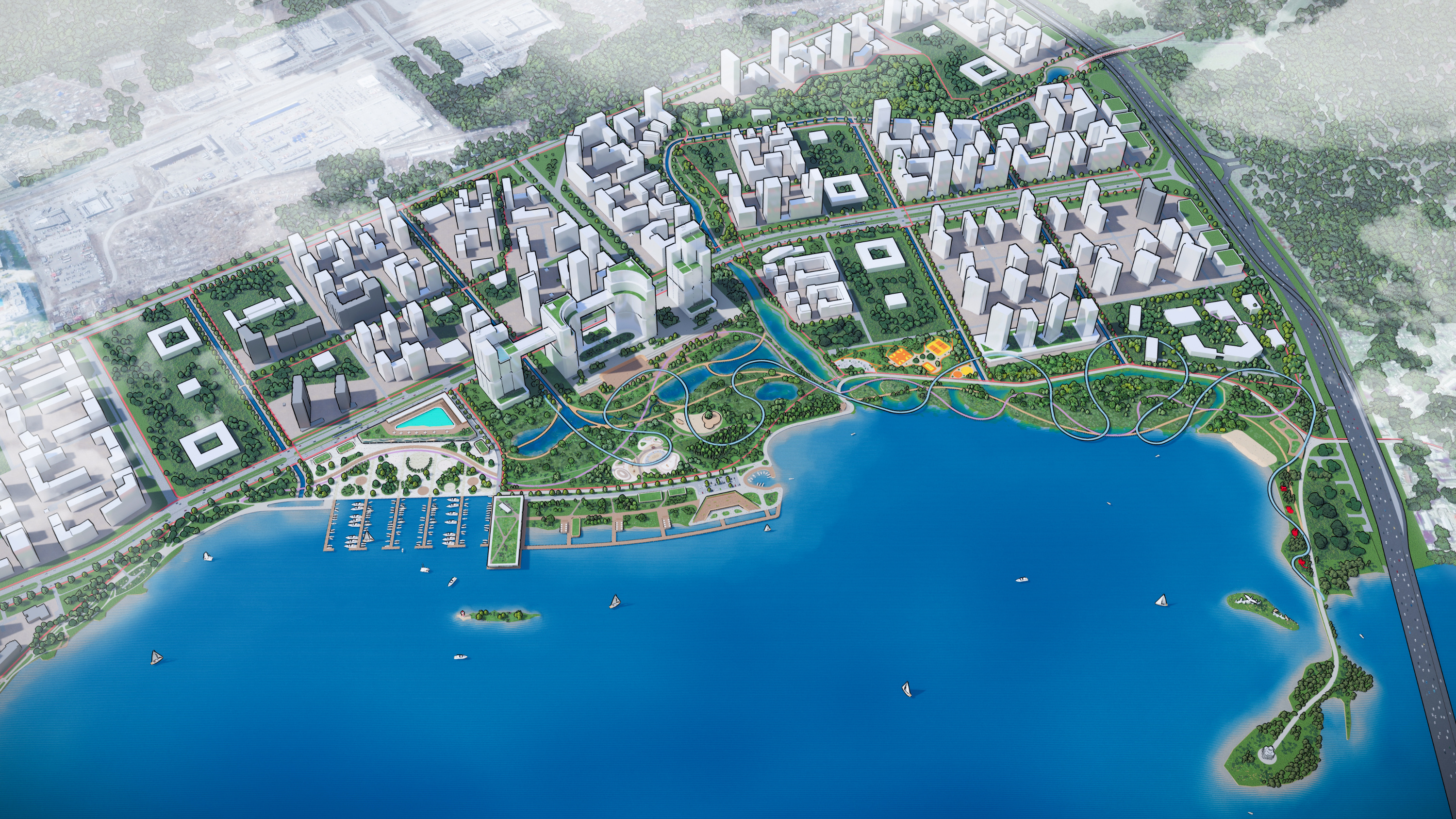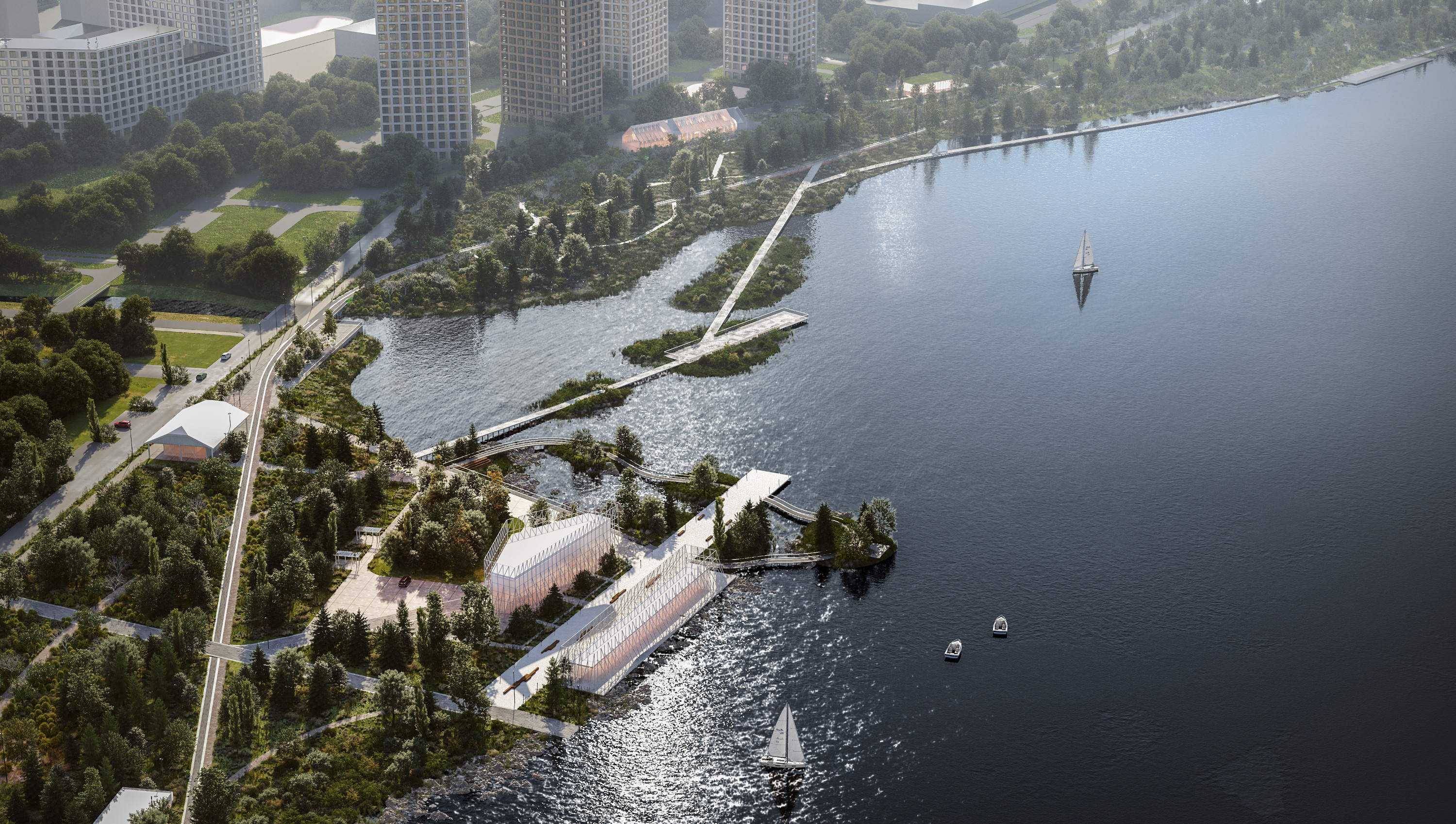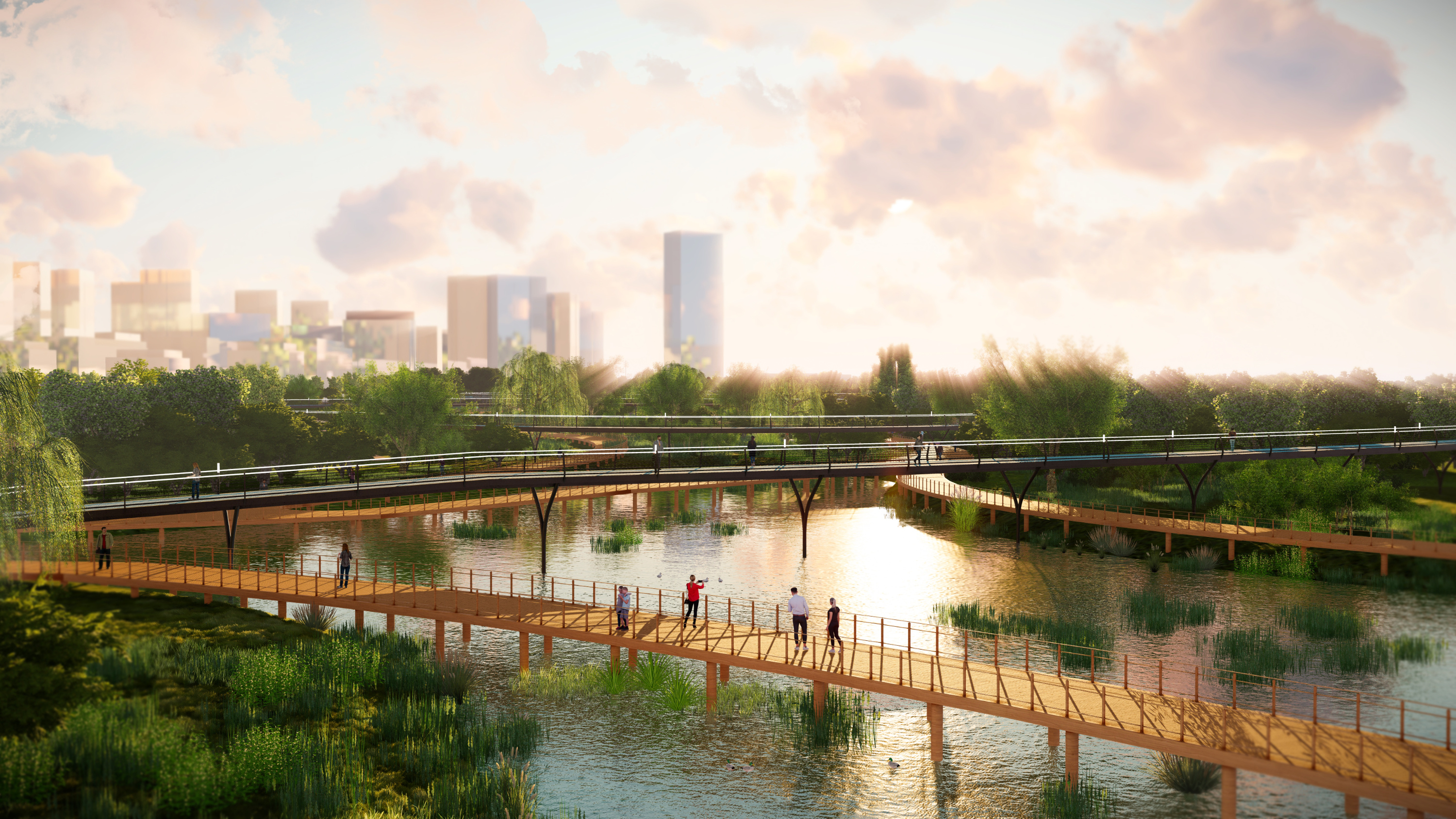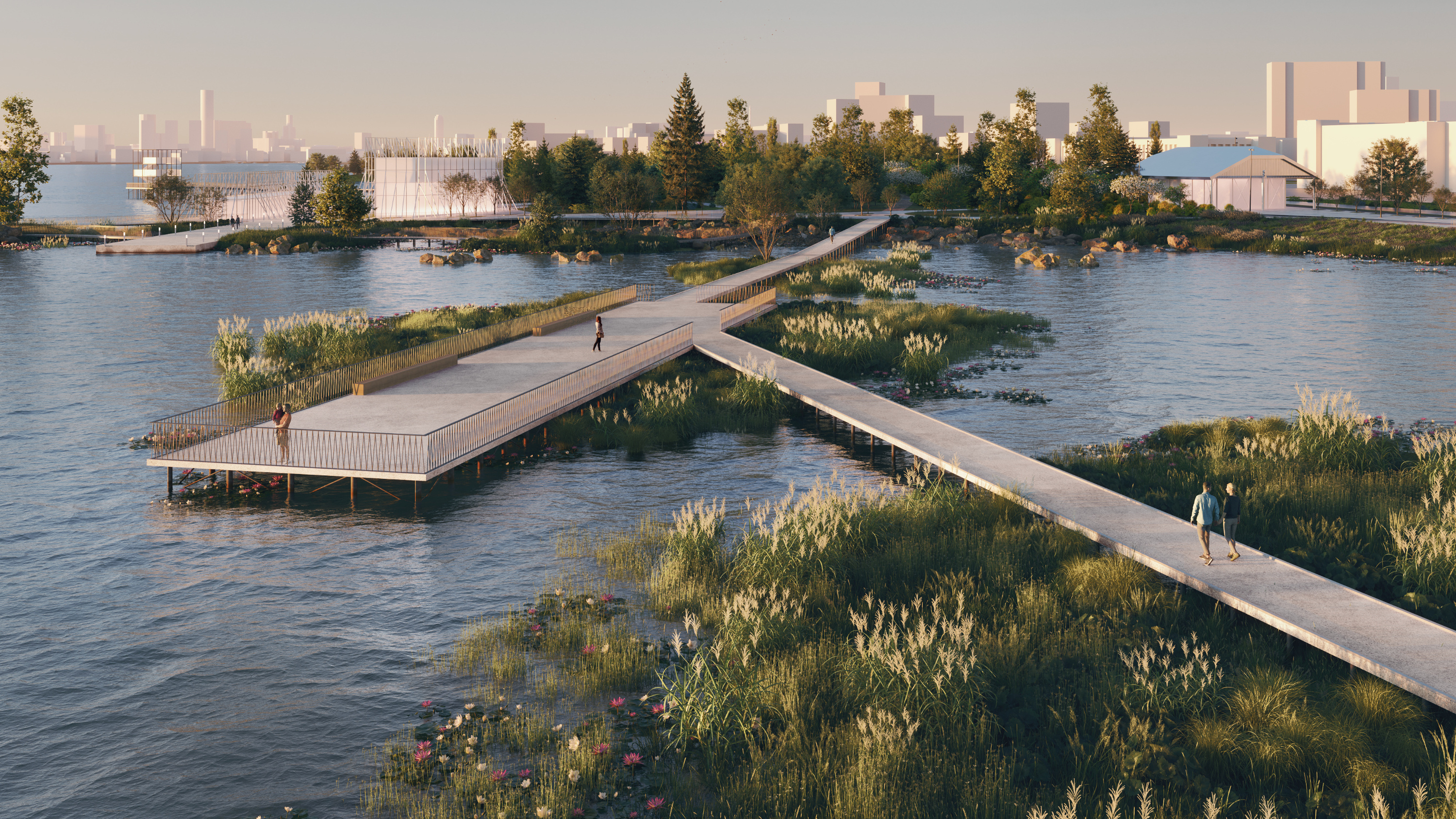 Чтобы было больше зелени и воды — городской парк с прудами. Выглядит как кадр из фильма про будущее.