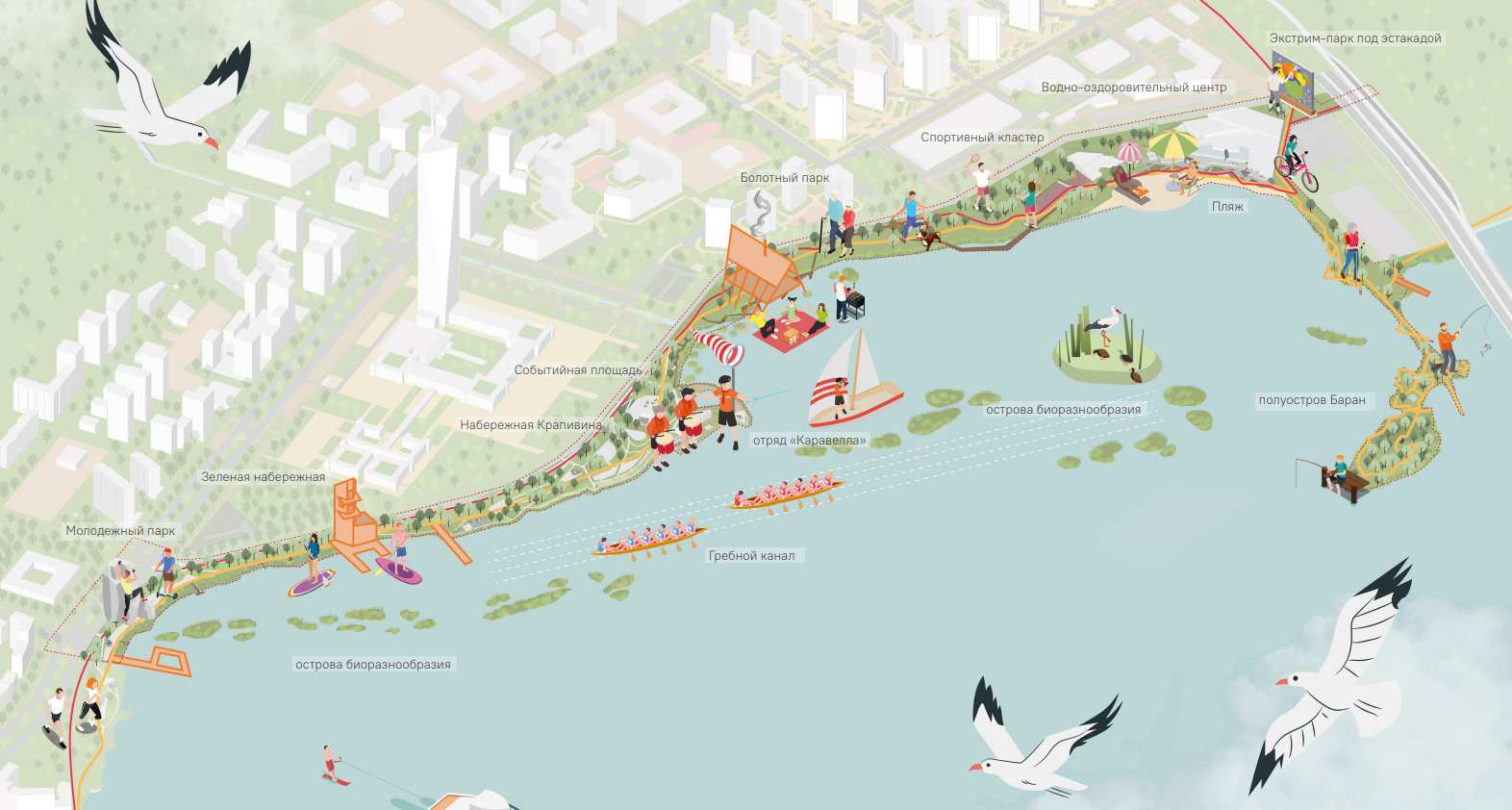 Набережную предлагают условно поделить на три зоны. В первой — это самое начало набережной, в районе улицы Лоцмановых — помимо детских площадок, кафе, причала и проката сапбордов предлагают оборудовать зону для гребли и сделать каток, который будет работать зимой.