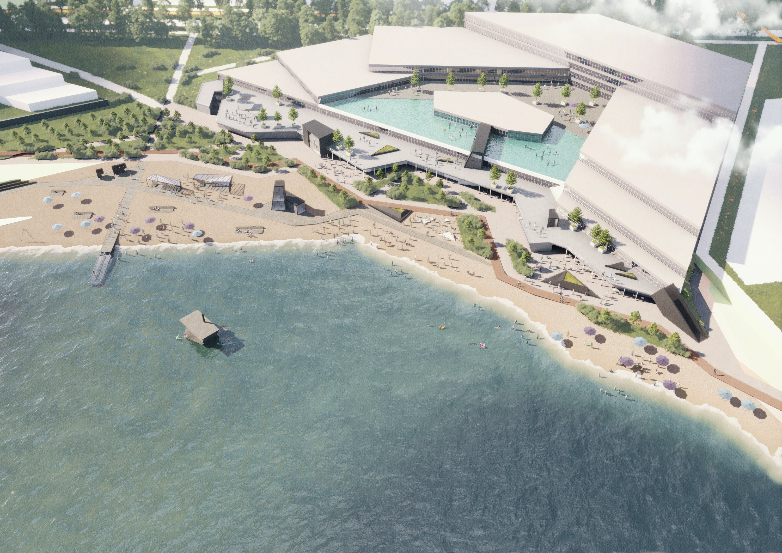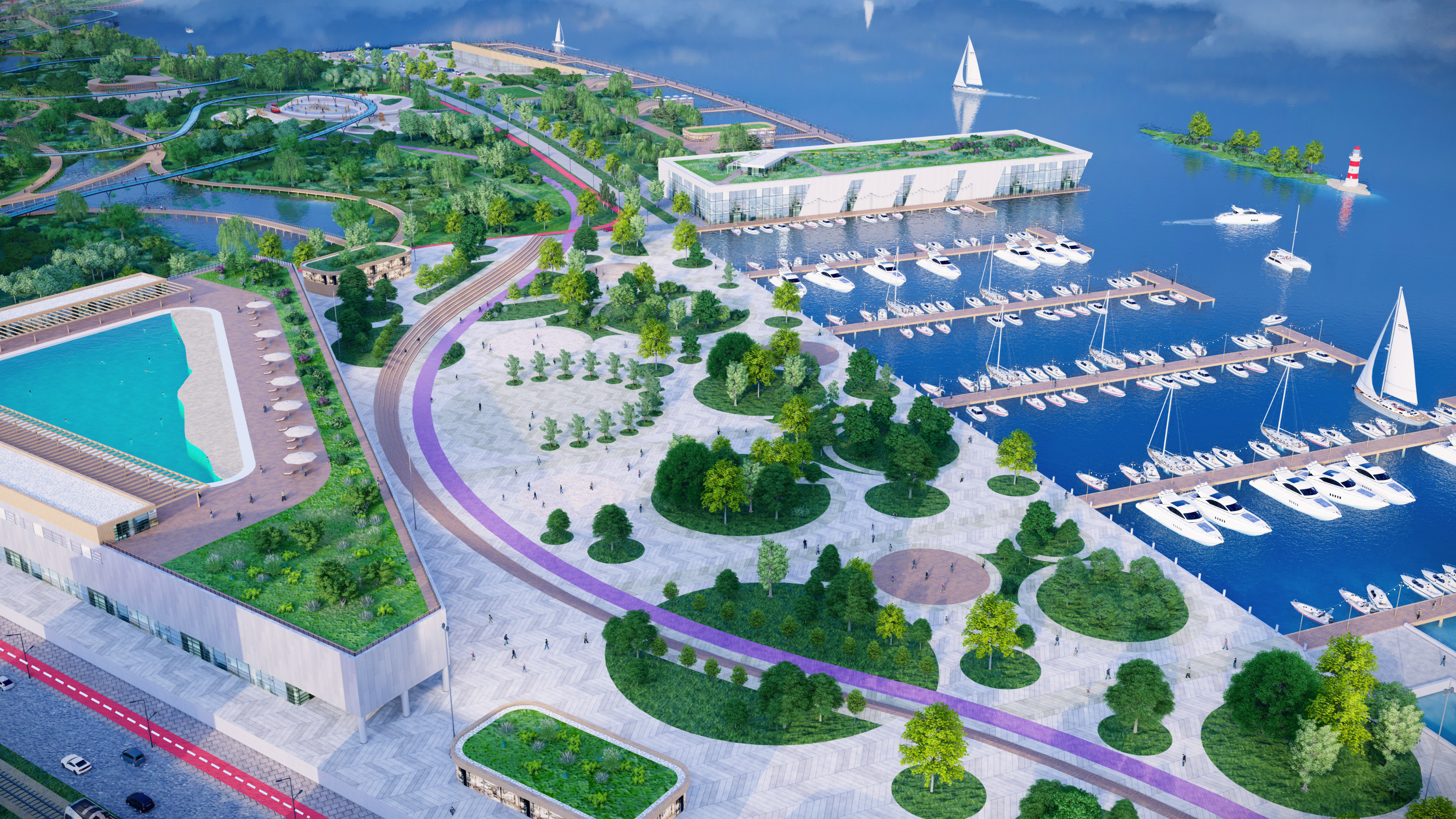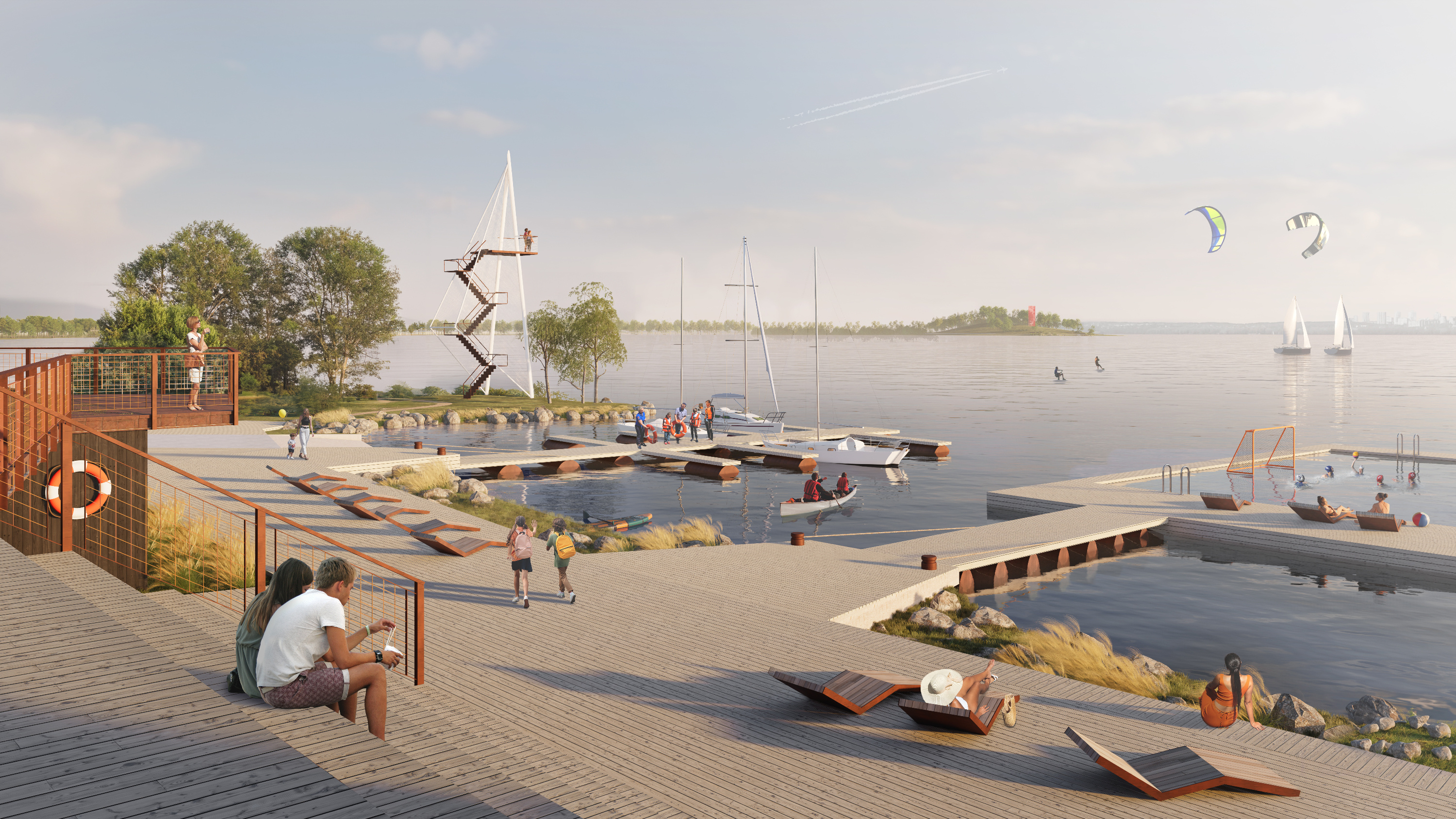 А так может поменяться зона у яхт-клуба. Обратите внимание на плавучий бассейн для водного поло. Тут же может быть мангальная зона, игровая и смотровая башня.