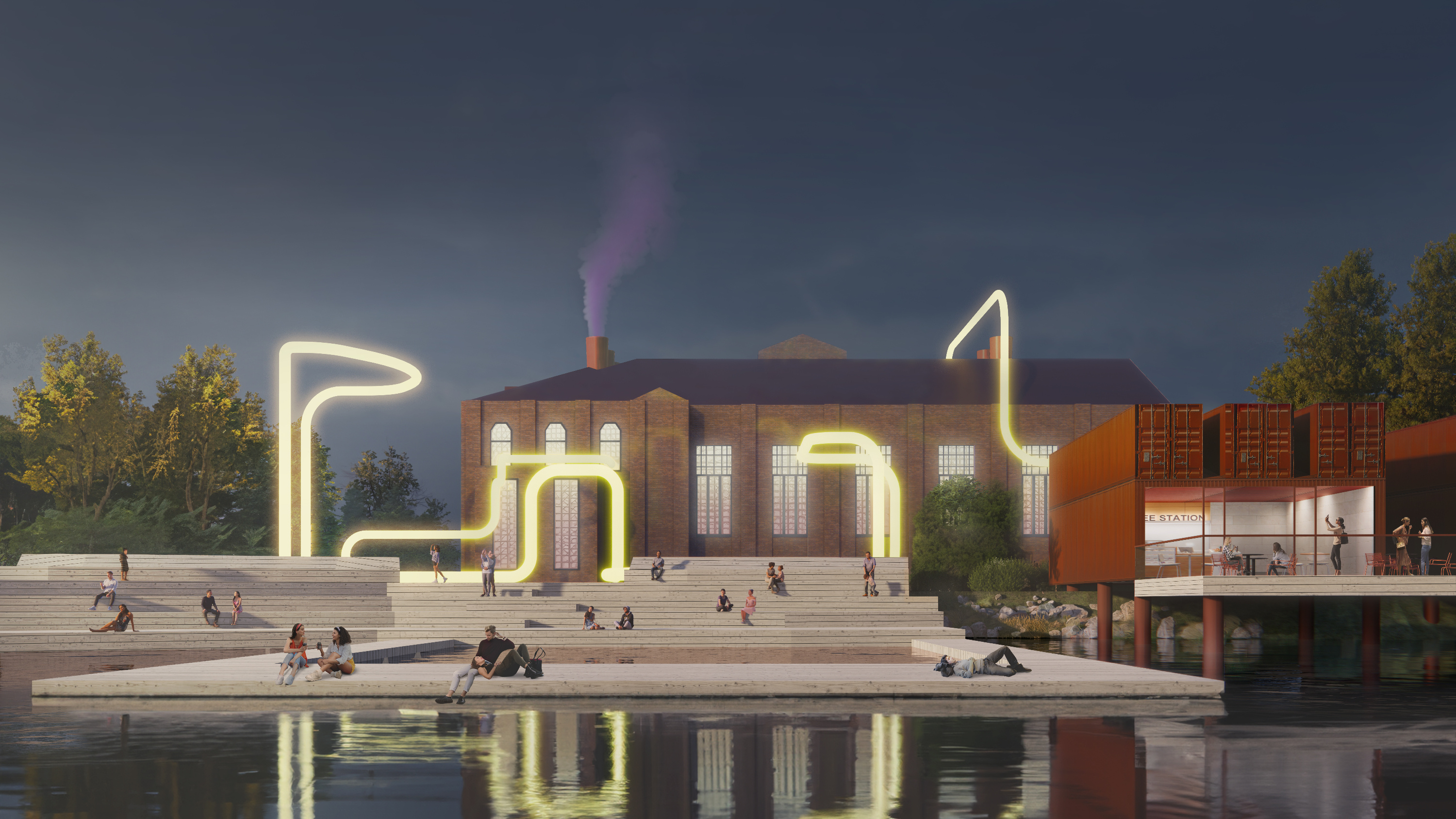 В районе ГЭС предлагают создать парк энергии природы с главным элементом — светящимся кабелем. Еще тут будет амфитеатр под открытым небом, бары и гигантская песочница с горкой.