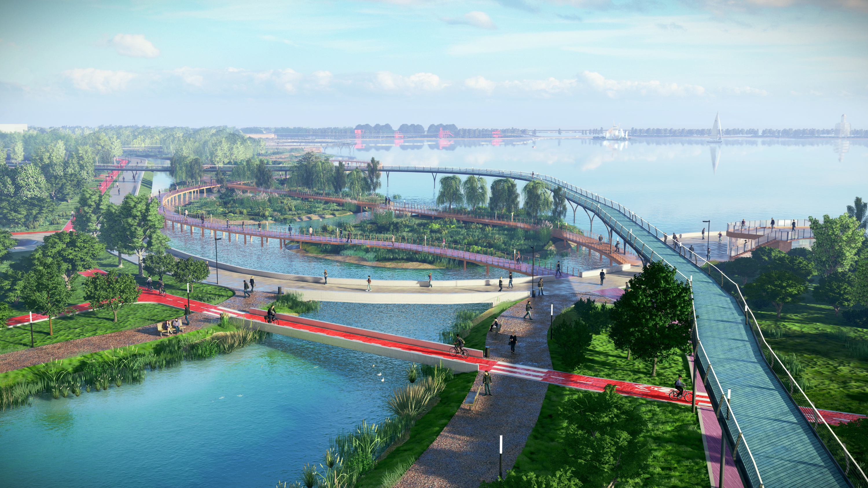 По каналам можно будет передвигаться на лодке, каноэ или сапе, а пешеходные и велодорожки в итоге сходятся воедино.