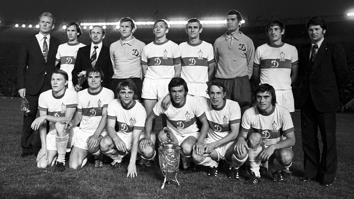 Футбольная команда «Динамо» (Киев). Стоят (слева направо): тренер Михаил Коман, Анатолий Боговик, врач Виктор Берковский, Виталий Хмельницкий, Роман Журавский, Евгений Рудаков, Владимир Веремеев, Стефан Решко, Анатолий Бышовец, Владимир Онищенко, Виктор Колотов, старший тренер Александр Севидов.