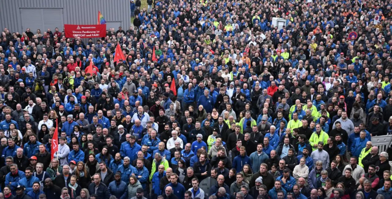 ▪️ Почему так происходит, понятно. Печальных экономических новостей из ФРГ — хоть отбавляй. В ночь на сегодня, к примеру, немецкий профсоюз IG Metall начал забастовки в металлургической и электротехнической отраслях Германии (на фото), после того как немецкий автомобильный гигант Volkswagen подтвердил закрытие по меньшей мере трёх автомобильных заводов в стране. Последствия могут коснуться от 300 тыс. сотрудников самого VW до 3,9 млн человек, занятых в смежных отраслях за счёт мультипликативного эффекта.