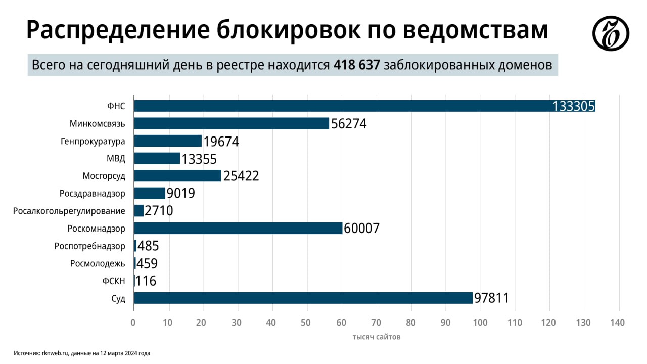 Среди основных заблокированных категорий в службе называют фейки о боевых действиях на Украине, экстремистский, пронаркотический контент, азартные игры. Всего на сегодняшний день в реестре находится 41,6 тыс. доменов. Каждый день этот показатель увеличивается в среднем на 100-200 сайтов, следует из статистики Роскомнадзора. Больше всего решений о блокировке доменов выносит ФНС. При этом число разблокированных доменов в день не превышает 20.