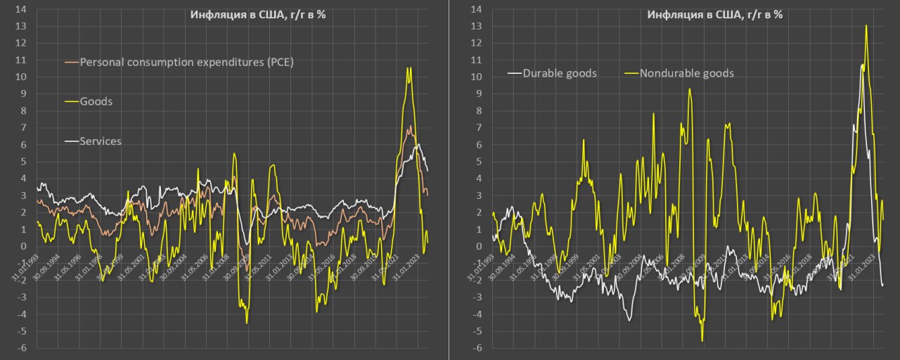 Максимальный зафиксированный рост PCE был 7.1% г/г в июне 2022, в октябре 2022 ценовой индекс рос в темпах 6.3% г/г, а в октябре 2023 – 3% г/г (соответствует 0.25% среднемесячным темпам) - минимальный темпы с марта 2021.