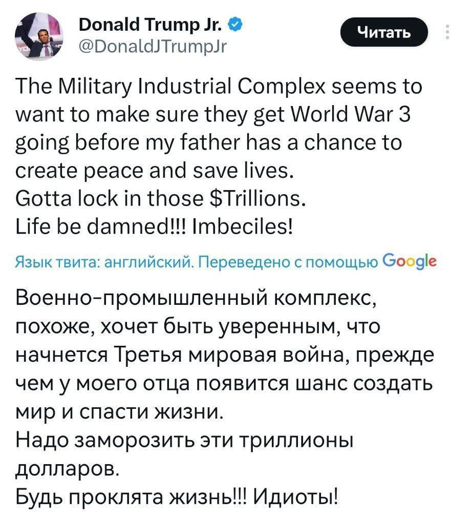 Дональд Трамп — младший назвал имбецилами Байдена и его советников. «К черту жизнь!!! Имбецилы», — написал он.