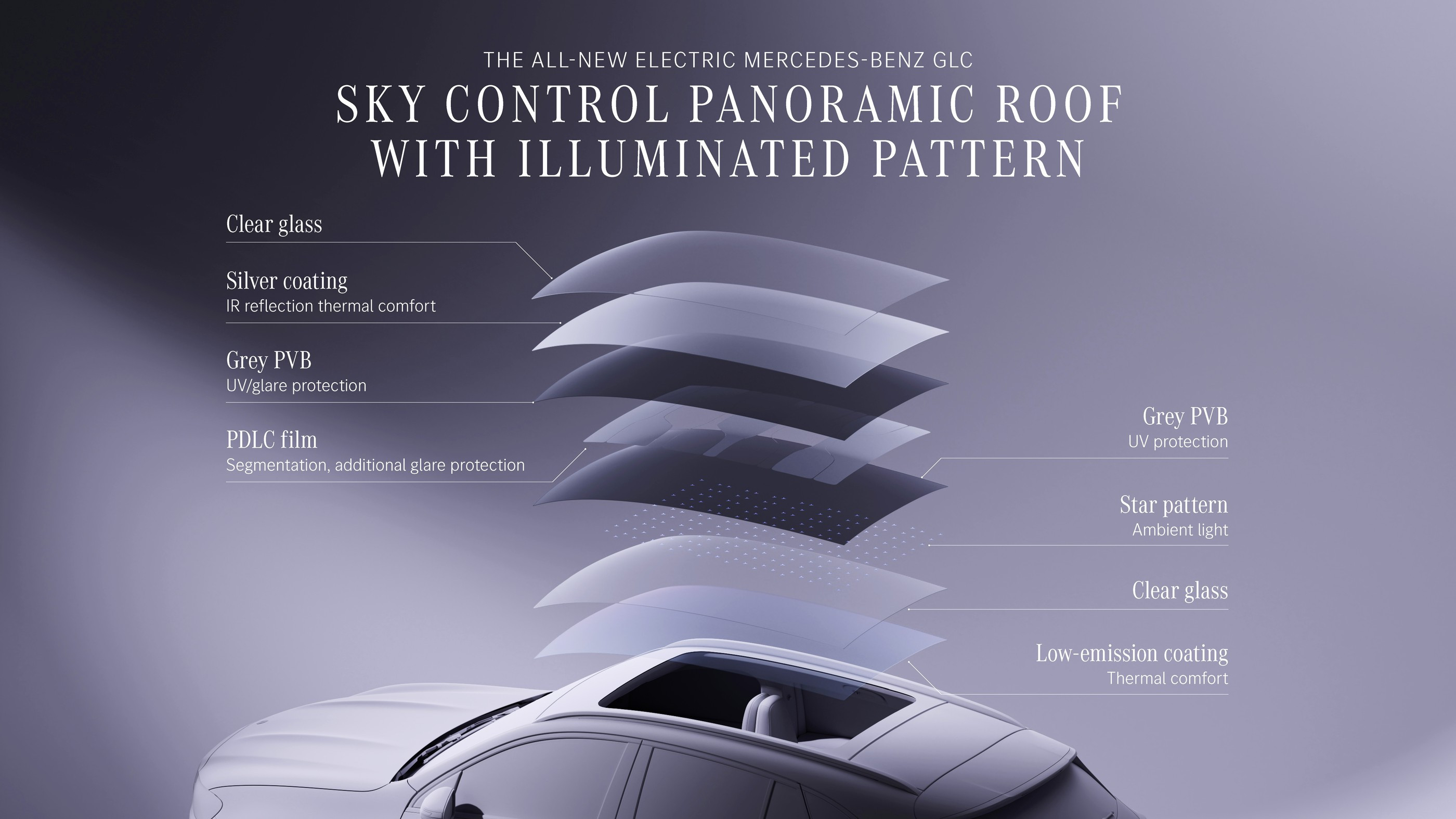 Салон Mercedes-Benz GLC with EQ Technology был рассекречен ещё в минувшую пятницу. Главное новшество здесь — монолитное табло MBUX Hyperscreen с диагональю 39,1 дюйма (99,3 см), но оно положено только самым дорогим версиям кроссовера. В комплектациях попроще будет трёхэкранное табло MBUX Superscreen, в которое входят 10,3-дюймовый приборный экран, 14-дюймовый центральный мультимедийно-настроечный экран и отдельный 14-дюймовый развлекательный экран для переднего пассажира. Ну а в базовой комплектации будет тоже трёхэкранное табло, только третий, пассажирский экран здесь с максимально урезанным функционалом — на него можно вывести какую-нибудь фотографию или одну из 12 фирменных декоративных заставок, то есть, по сути, это обычная фоторамка. Ещё одна интересная опция — многослойная панорамная стеклянная крыша Sky Control, способная менять степень прозрачности и зажигать искусственные звёзды, их имитируют 162 светодиода. Салон может быть обшит исключительно веганской кожей, но натуральная тоже пока доступна. Объём основного багажника — 570 л, со сложенными спинками заднего дивана — 1740 л, в передней части кузова есть дополнительный 100-литровый багажник.