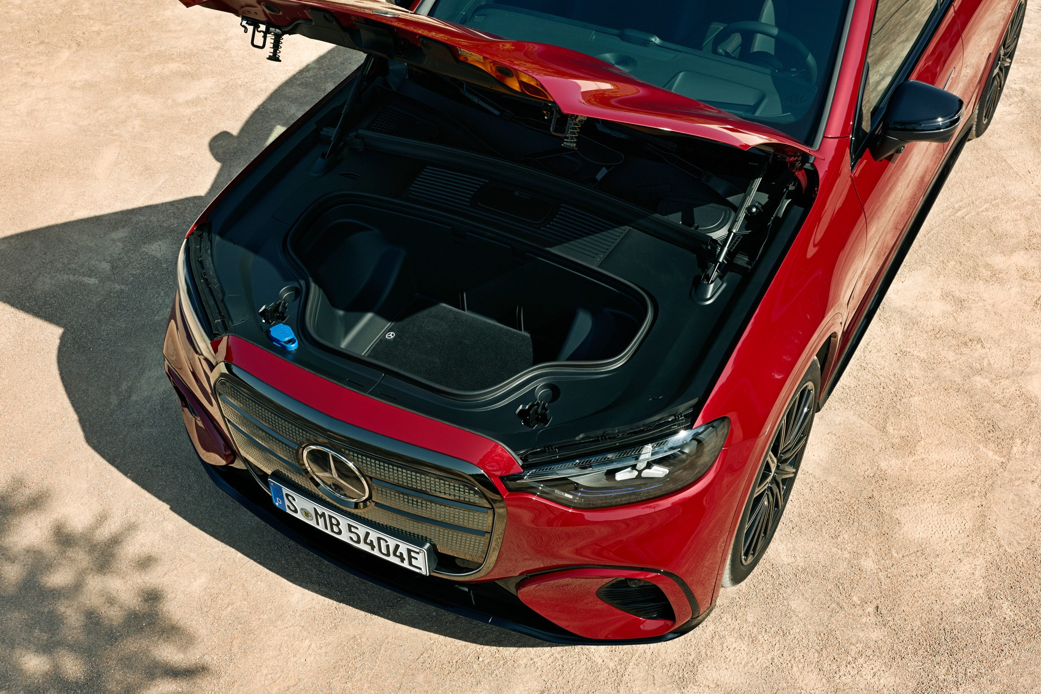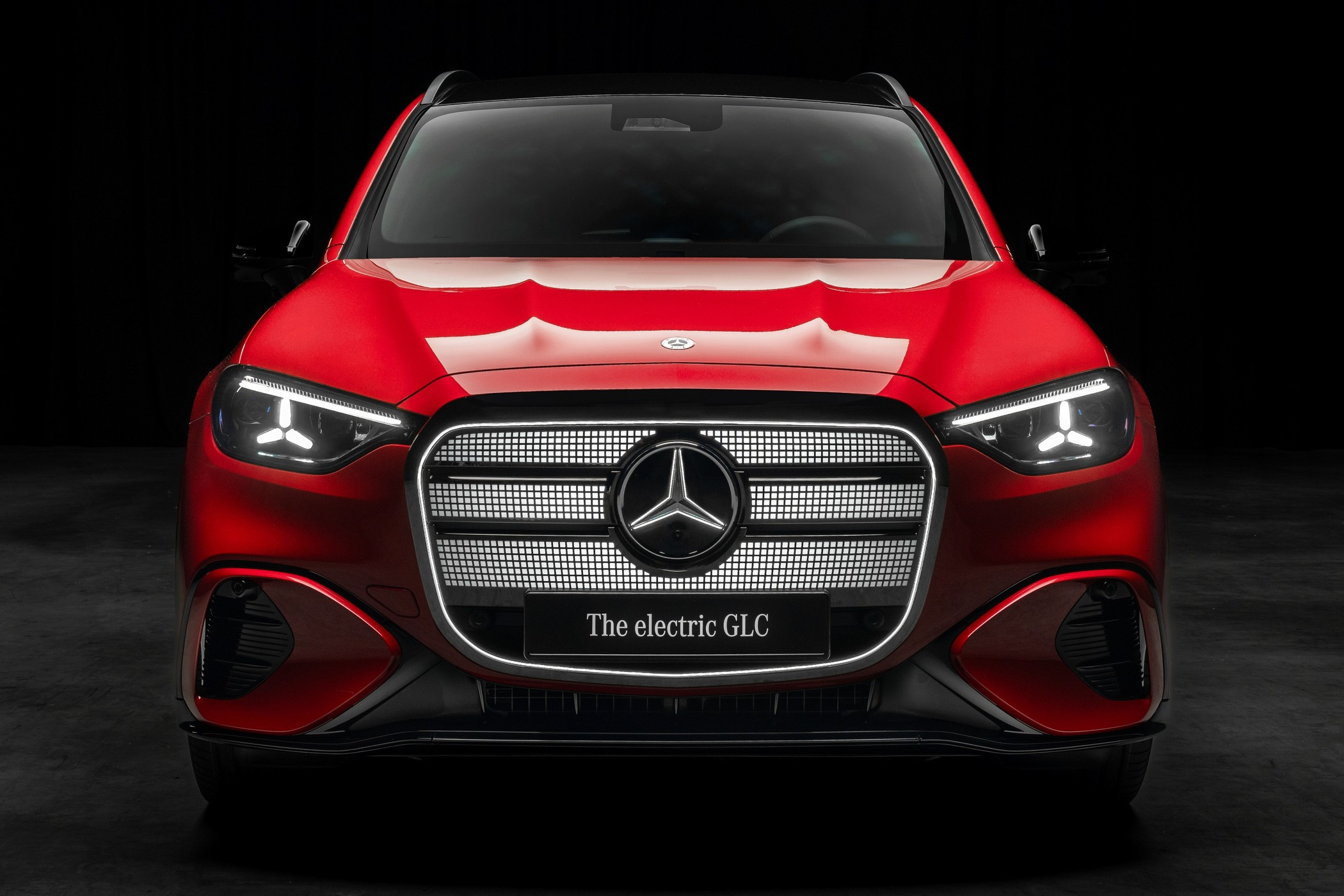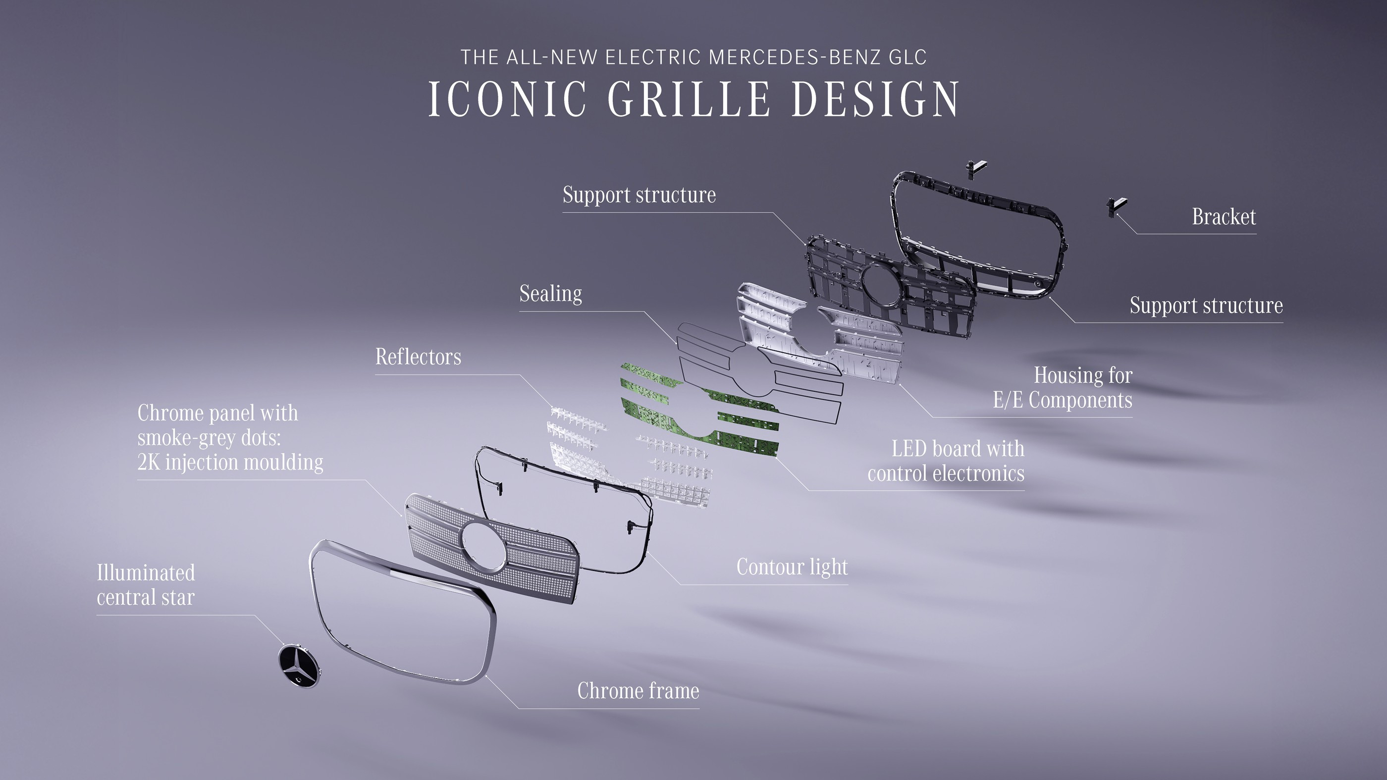Электрический GLC стал первым носителем фирменной радиаторной решётки Mercedes-Benz нового образца: она окружена толстой хромированной рамкой, а традиционные для марки горизонтальные планки внутри этой рамки выполнены в виде светящихся панелей из матового стекла. За доплату будет предложена пиксельная структура этих планок — конкретно у GLC with EQ Technology решётка набрана из 942 пикселей, способных создавать эффект анимации. Фары и фонари щеголяют светящимися трёхлучевыми звёздами. Большая фирменная эмблема на передке тоже снабжена подсветкой.