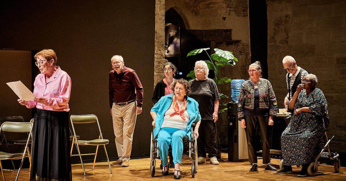 Clouée sur un fauteuil roulant, Jacqueline, 91 ans confie qu'elle a «tous les jours envie de faire l'amour». Vaillant malgré une péritonite et un infarctus, Jean-Pierre, 85 ans s'applique pour accomplir l'acte comme si c'était la dernière fois. Micheline n'aime pas «rentrer dans les gens», mais adore jouir dit-elle, un large sourire aux lèvres. Familier de la «performance documentaire», Mohamed El Khatib a conçu une pièce à partir des témoignages qu'il a recueillis dans des Ehpad, en France et en Belgique. Huit acteurs amateurs, un professionnel et une aide-soignante (Yasmine également chanteuse), les vieux -ils souhaitent qu'on les appelle ainsi- partagent leur conception et leur expérience de l'amour et de la sexualité avec un public attentif. Sans tabous et avec drôlerie. Sous le regard du metteur en scène qui garde son manuscrit entre les mains, ils ont droit chacun à leur tour à un morceau de bravoure. Étincelante Jacqueline qui récite une tirade de Bérénice. En déambulateur, Sally raconte qu'elle n'a découvert l'orgasme qu'à 40 ans. Depuis, elle se rattrape avec un Mexicain «caliente». Sur un écran, on peut lire que deux défibrillateurs sont disponibles sur scène. La salle éclate de rire. Ces vieux, plus jeunes que les jeunes, expriment distinctement leurs rêves avortés et leurs désirs toujours présents. En troupe, ils expliquent qu'ils songent à créer un «spectacle qui donne envie de vivre». C'est ce qu'a réussi à faire, avec leur concours, leur «chef», Mohamed El Khatib. Les spectateurs se lèvent pour les saluer. Jacqueline a les larmes aux yeux. N.S.