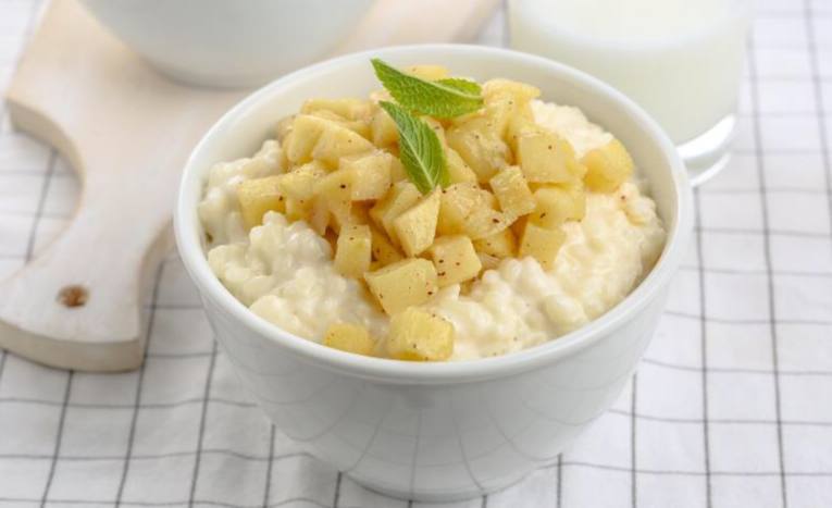 5. Когда рис готов, залейте к нему молоко. Перемешайте и варите на медленном огне, постоянно помешивая 2-3 минуты после закипания.