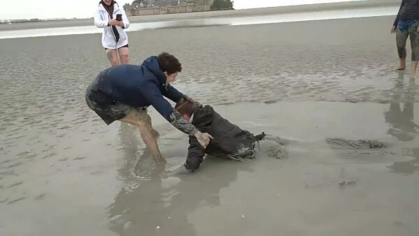В некоторых местах опасные зыбучие пески в последнее время стали достопримечательностью. Например, в Нормандии гиды во время отлива показывают туристам, как выбираться из зыбучего песка возле острова-крепости Мон-Сен-Мишель. После инструктажа можно попробовать сделать это самостоятельно. Получается не у всех (Stephane Gueno / YouTube)