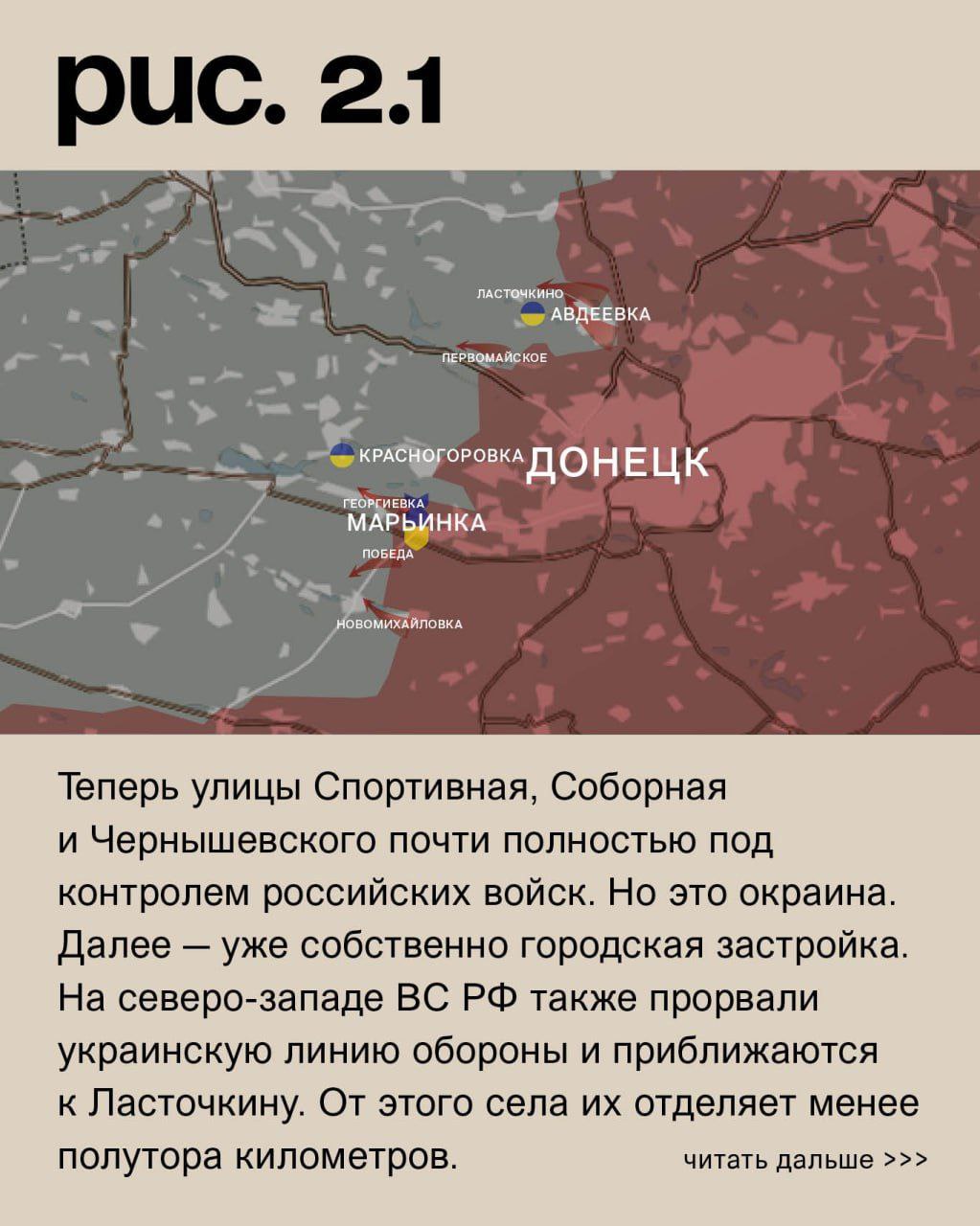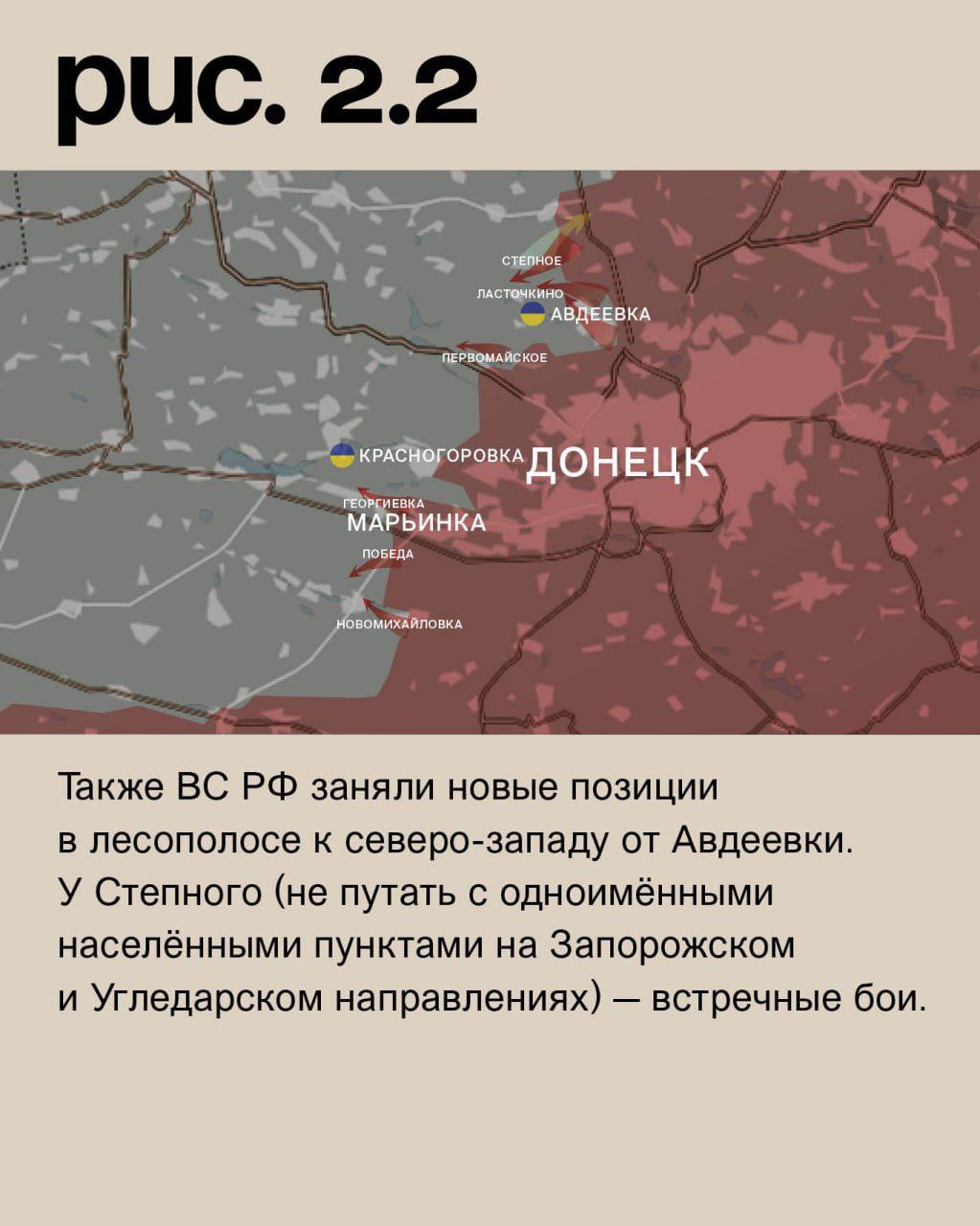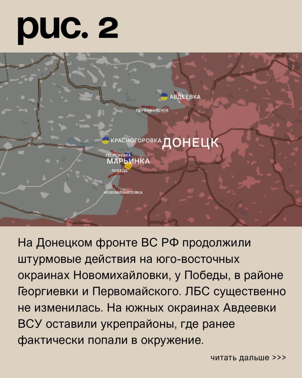На Донецком фронте ВС РФ продолжили штурмовые действия на юго-восточных окраинах Новомихайловки, у Победы, в районе Георгиевки и Первомайского. ЛБС существенно не изменилась. На южных окраинах Авдеевки ВСУ оставили укрепрайоны, где ранее фактически попали в окружение. Теперь улицы Спортивная, Соборная и Чернышевского почти полностью под контролем российских войск. Но это окраина. Далее – уже собственно городская застройка. На северо-западе ВС РФ также прорвали украинскую линию обороны и приближаются к Ласточкину. От этого села их отделяет менее полутора километров. Также ВС РФ заняли новые позиции в лесополосе к северо-западу от Авдеевки. У Степного (не путать с одноимёнными населёнными пунктами на Запорожском и Угледарском направлениях) – встречные бои. (Рис. 2)