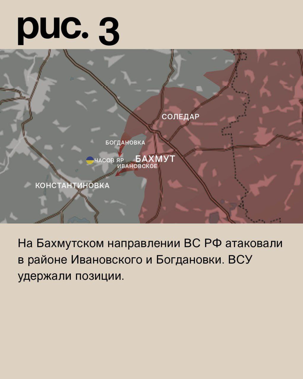 На Бахмутском направлении ВС РФ атаковали в районе Ивановского и Богдановки. ВСУ удержали позиции. (Рис. 3)